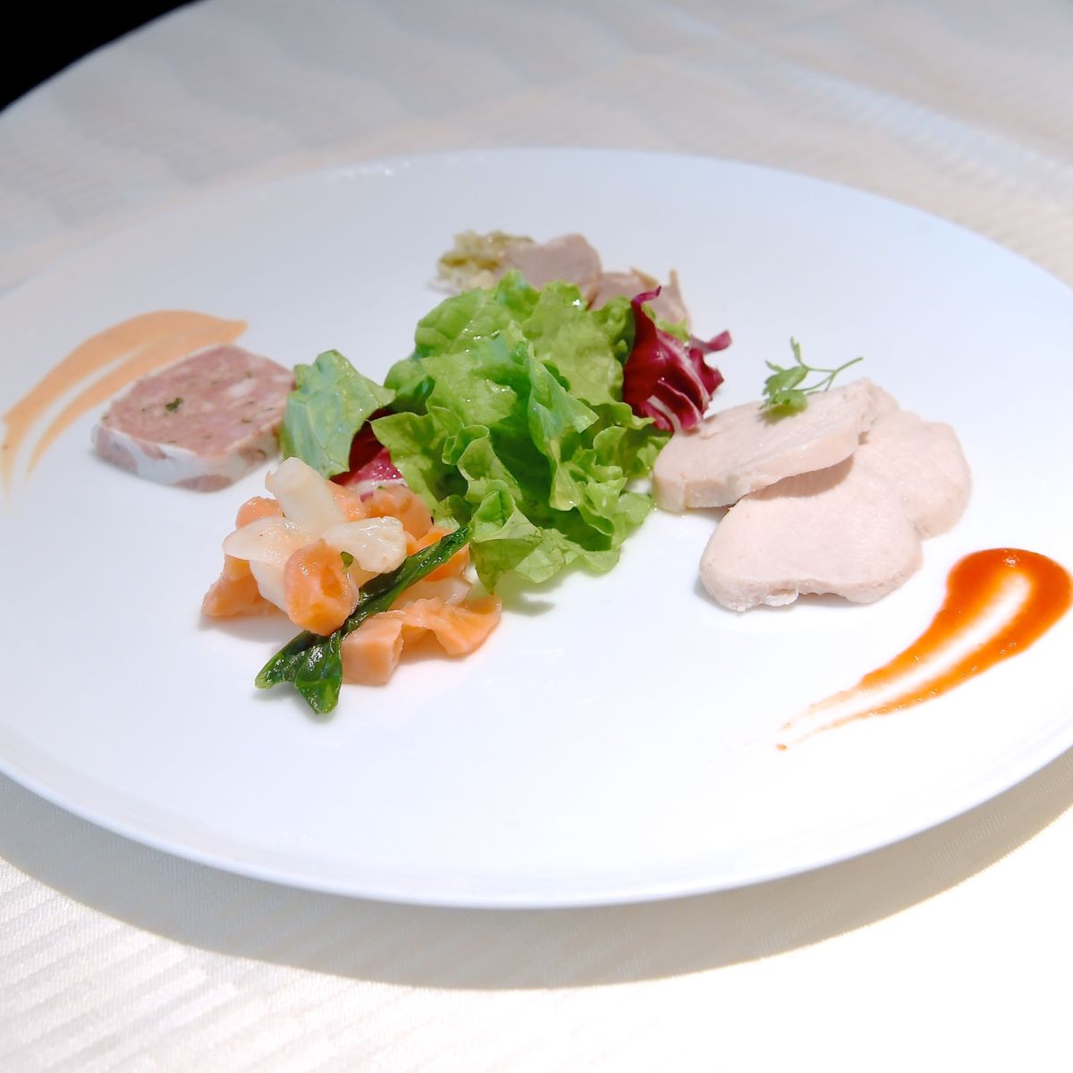 前菜はサーモンとお肉3種類。