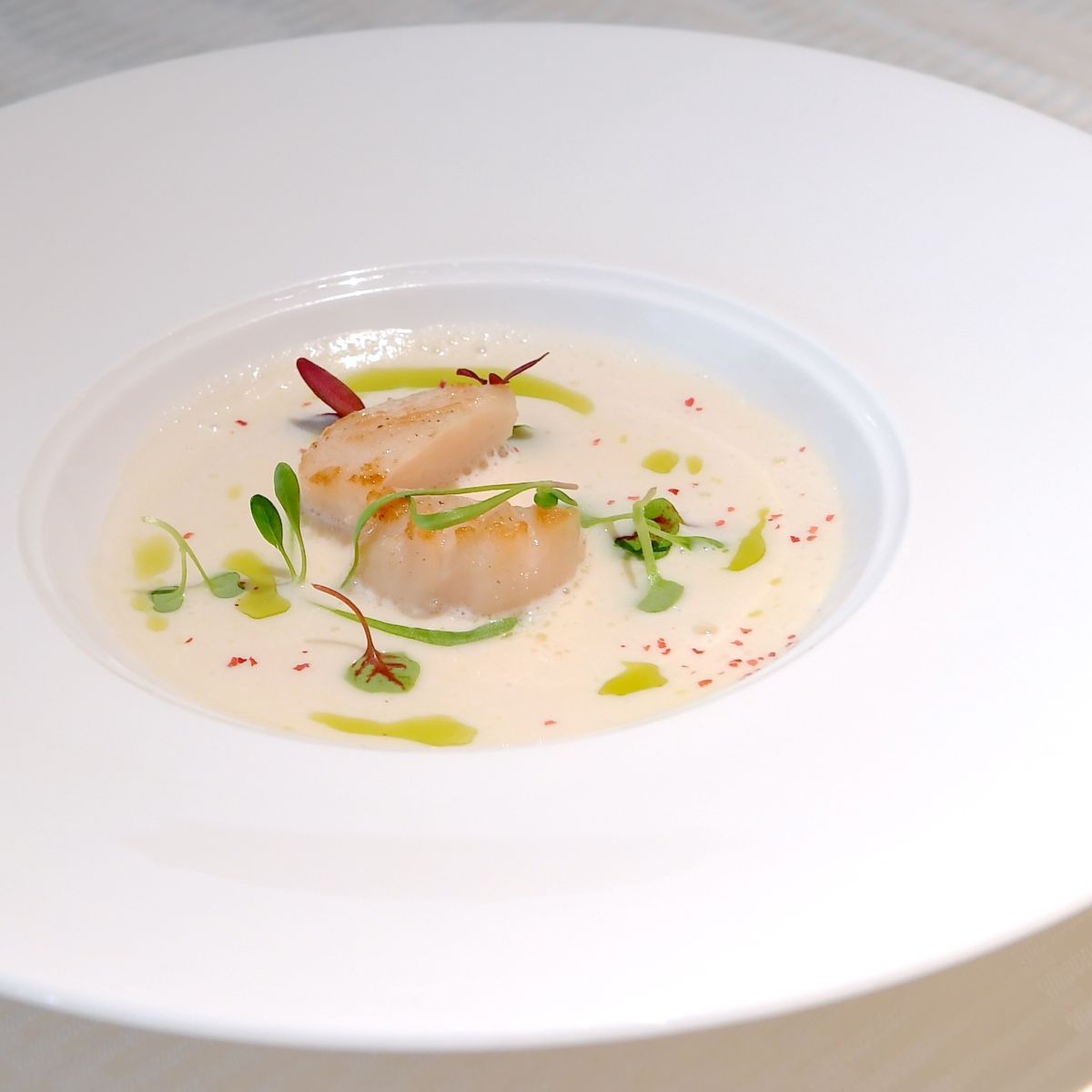 - 帆立貝のソテーと根セロリのポタージュ 青唐辛子と九条葱のオイル