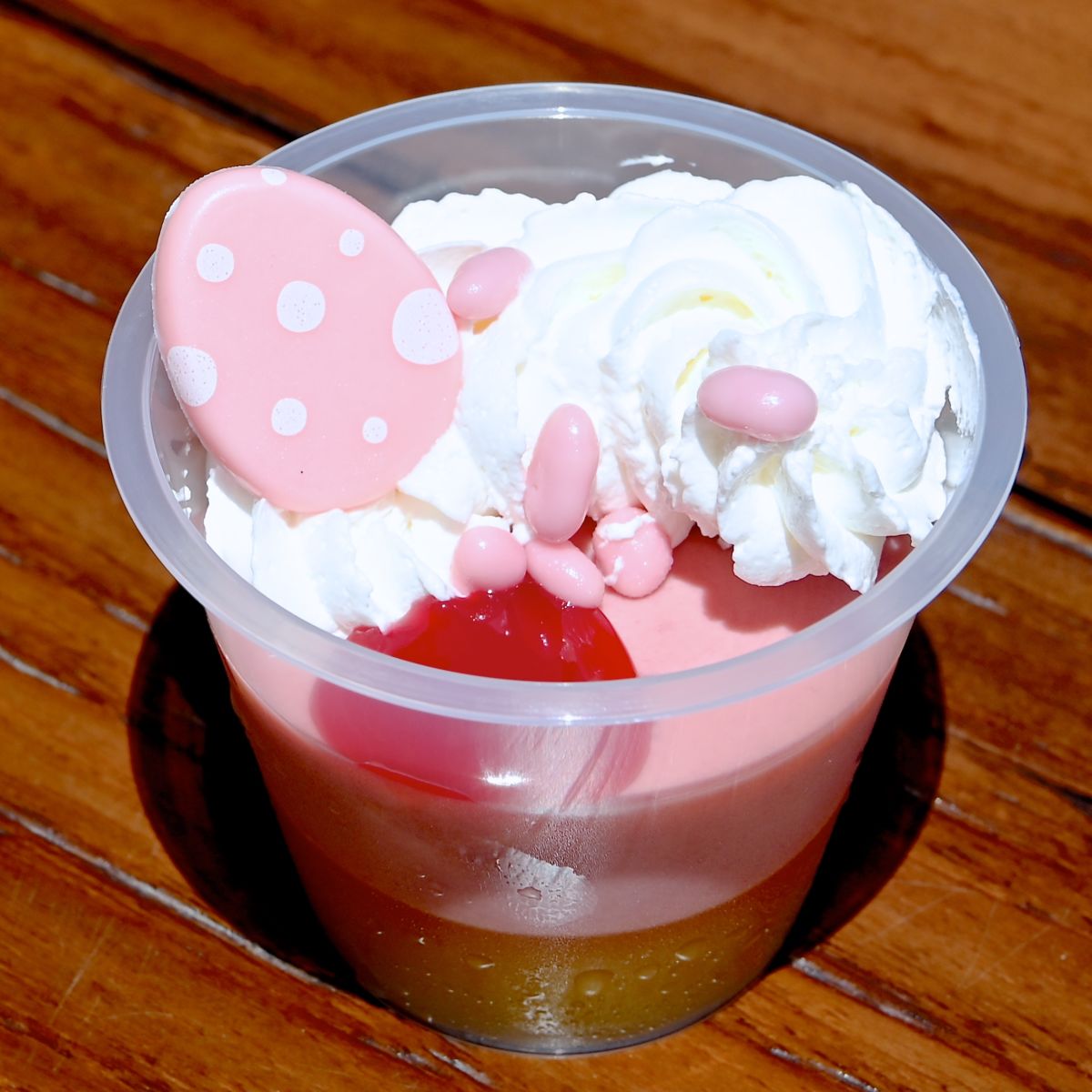 2層になったラズベリームースとオレンジゼリーの上に、イースターエッグ型のチョコレートやチョコスナック、ホイップクリーム、ラズベリーソースがトッピングされています。