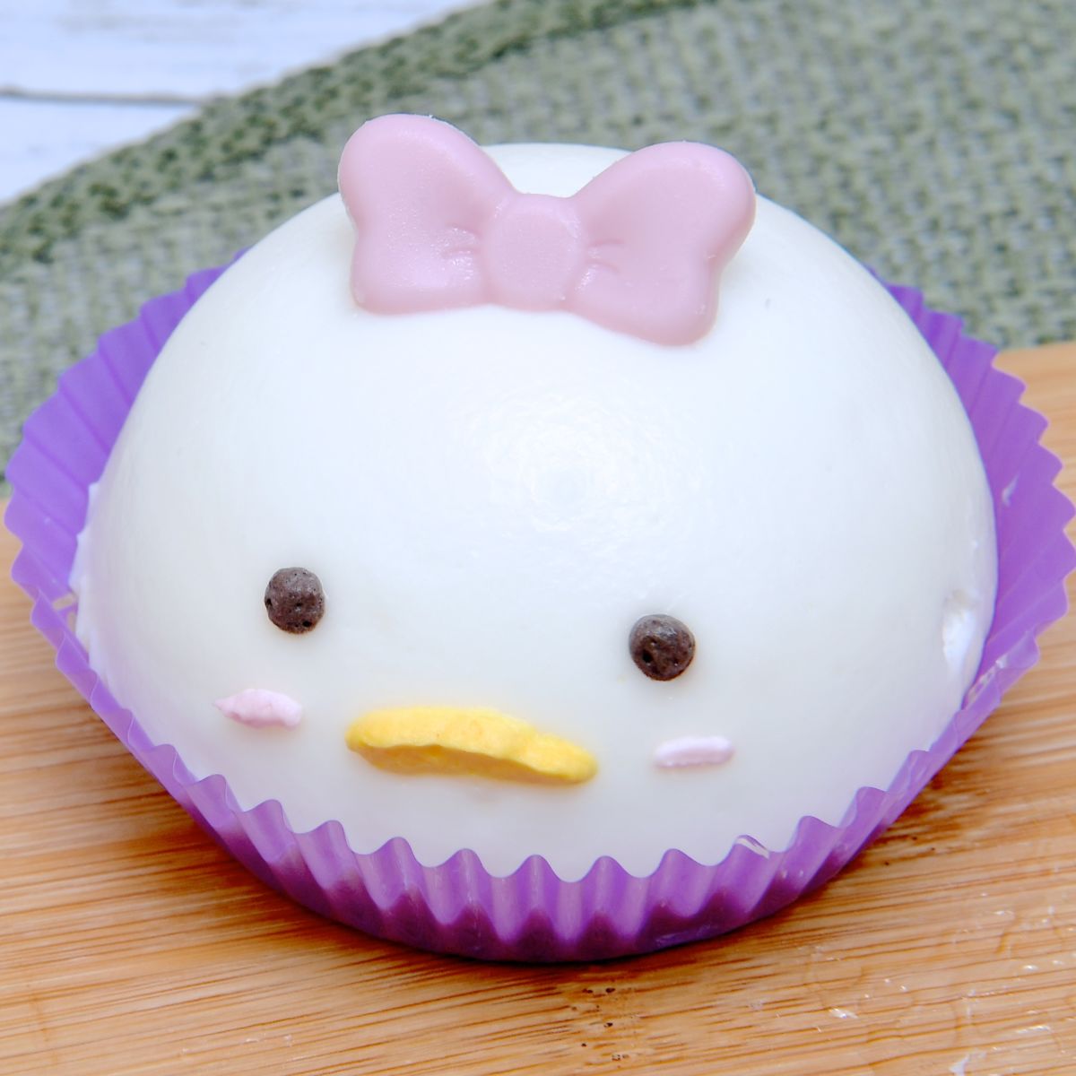 ころんとしたデイジーダックモチーフのケーキ。チョコレートのかわいいリボンがのっています。