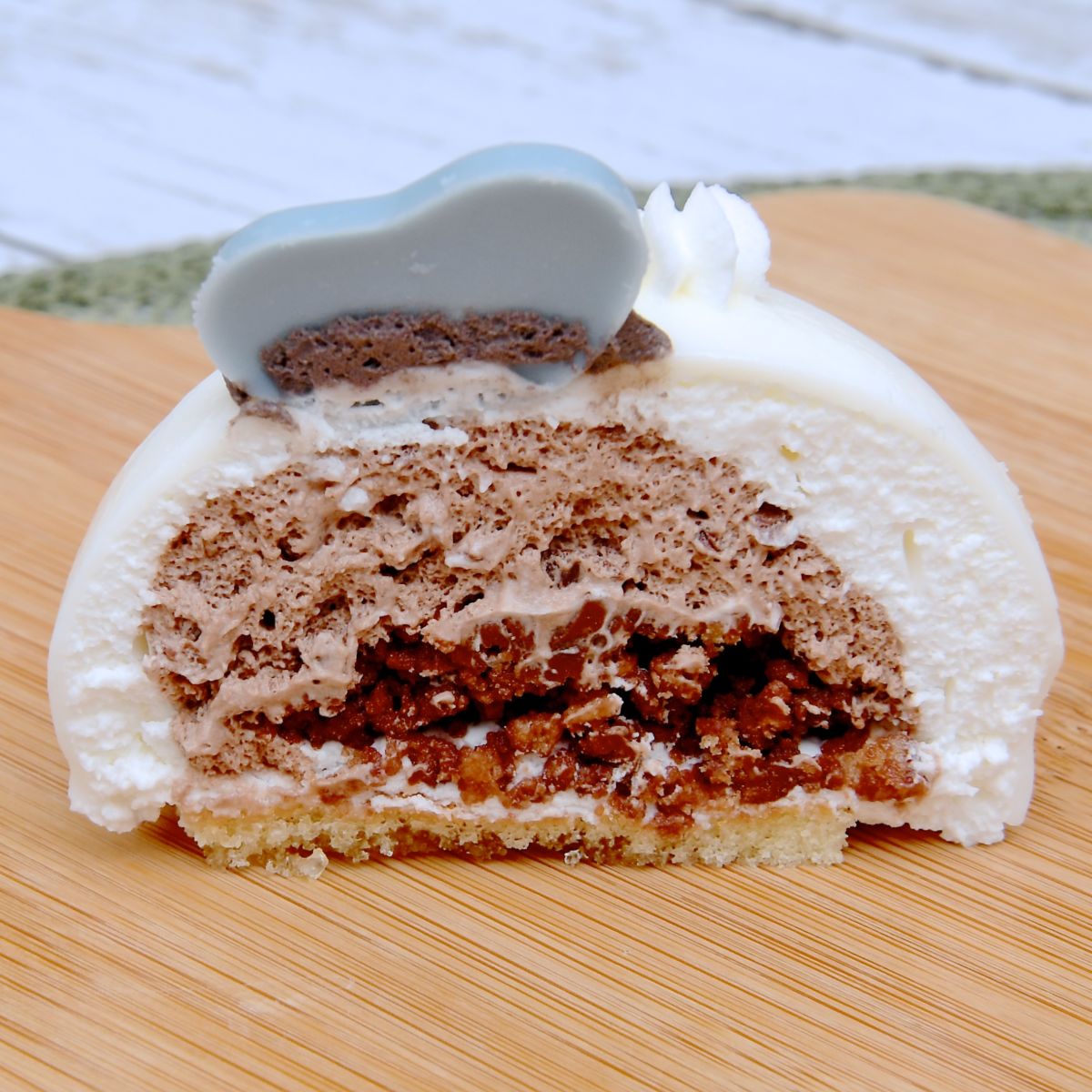 なめらかで真っ白な甘さ控えめのバニラクリームの内側に、けずりチョコ入りのチョコクリーム☆