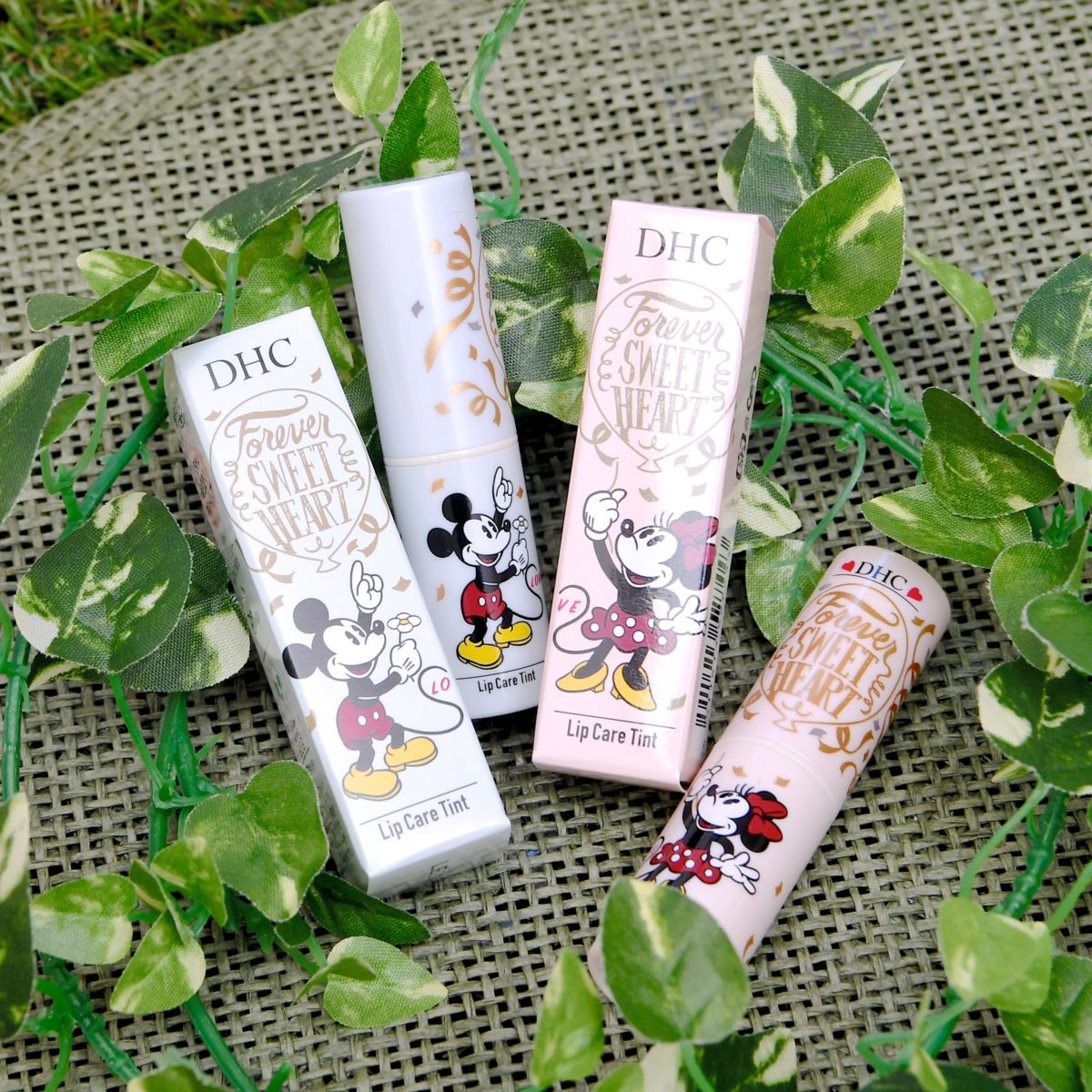 DHC LipCareTint(リップケアティント)のロゴ、バルーン、Forever SWEET HEARTの文字、ミッキーマウス、ミニーマウスがデザインされたパッケージに入ったティントリップ。