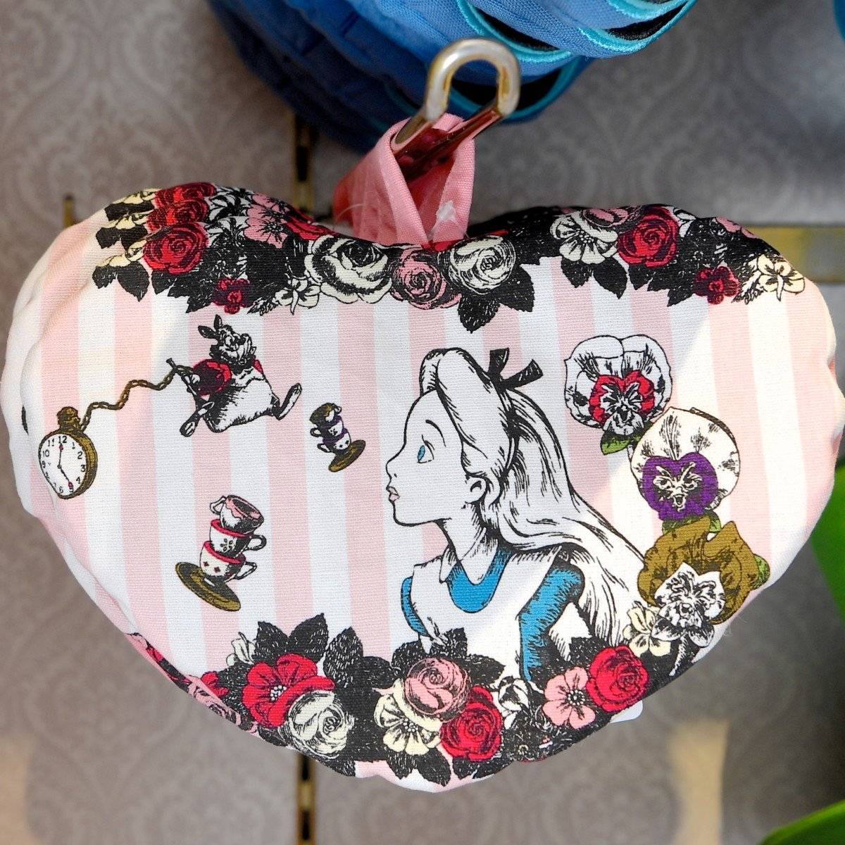 アリス、懐中時計を持って急ぐ白うさぎ(ホワイトラビット)、歌うお花たちがデザインされています。