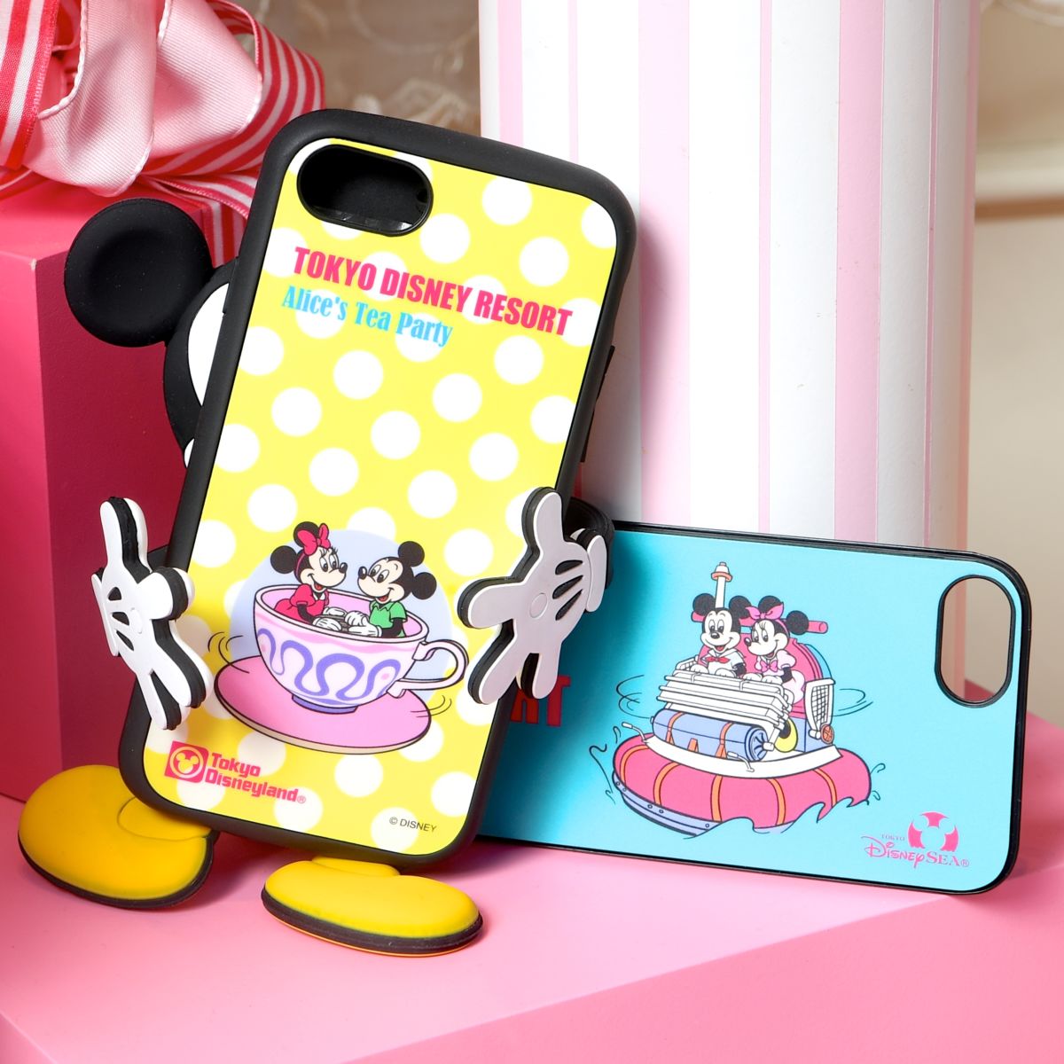 東京ディズニーシーのアトラクション「アクアトピア」、東京ディズニーランドのアトラクション「アリスのティーパーティー」を楽しむレトロなミッキーマウス&ミニーマウスデザインの2種類のバックパネルが付いたスマートフォンケース。