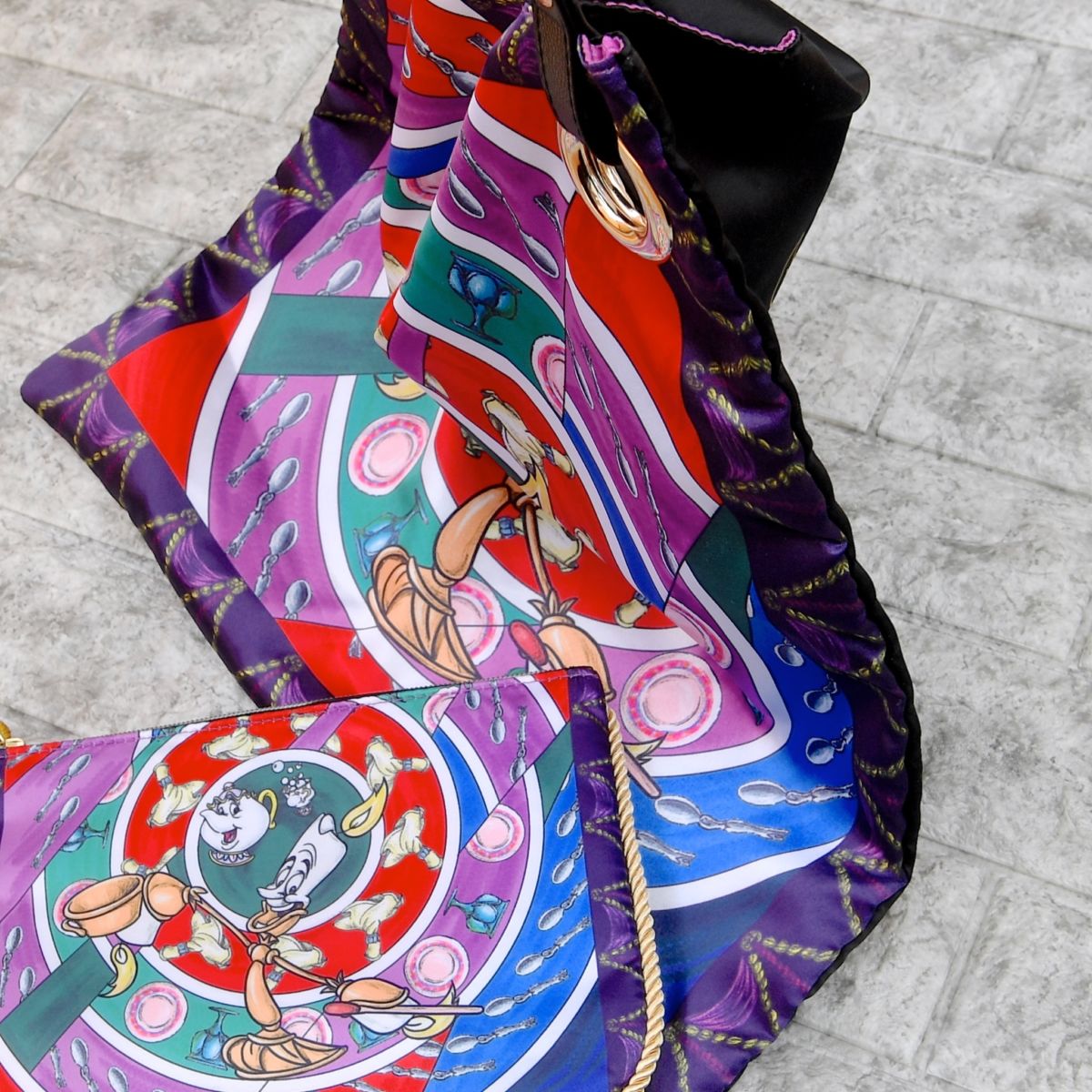 ルミエールたちがベルをもてなすシーン、踊る食器たちを重ねたアートが魅力的なトートバッグ。