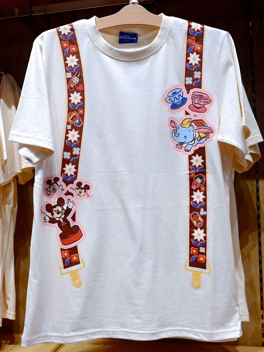 サスペンダーデザインに、「ミッキーのフィルハーマジック」「空飛ぶダンボ」「アリスのティーパーティー」