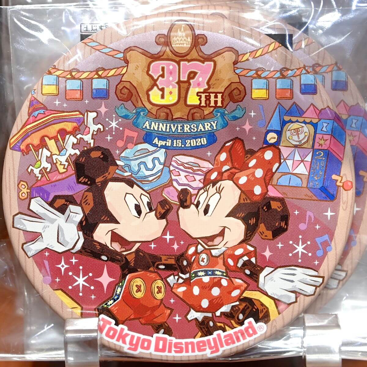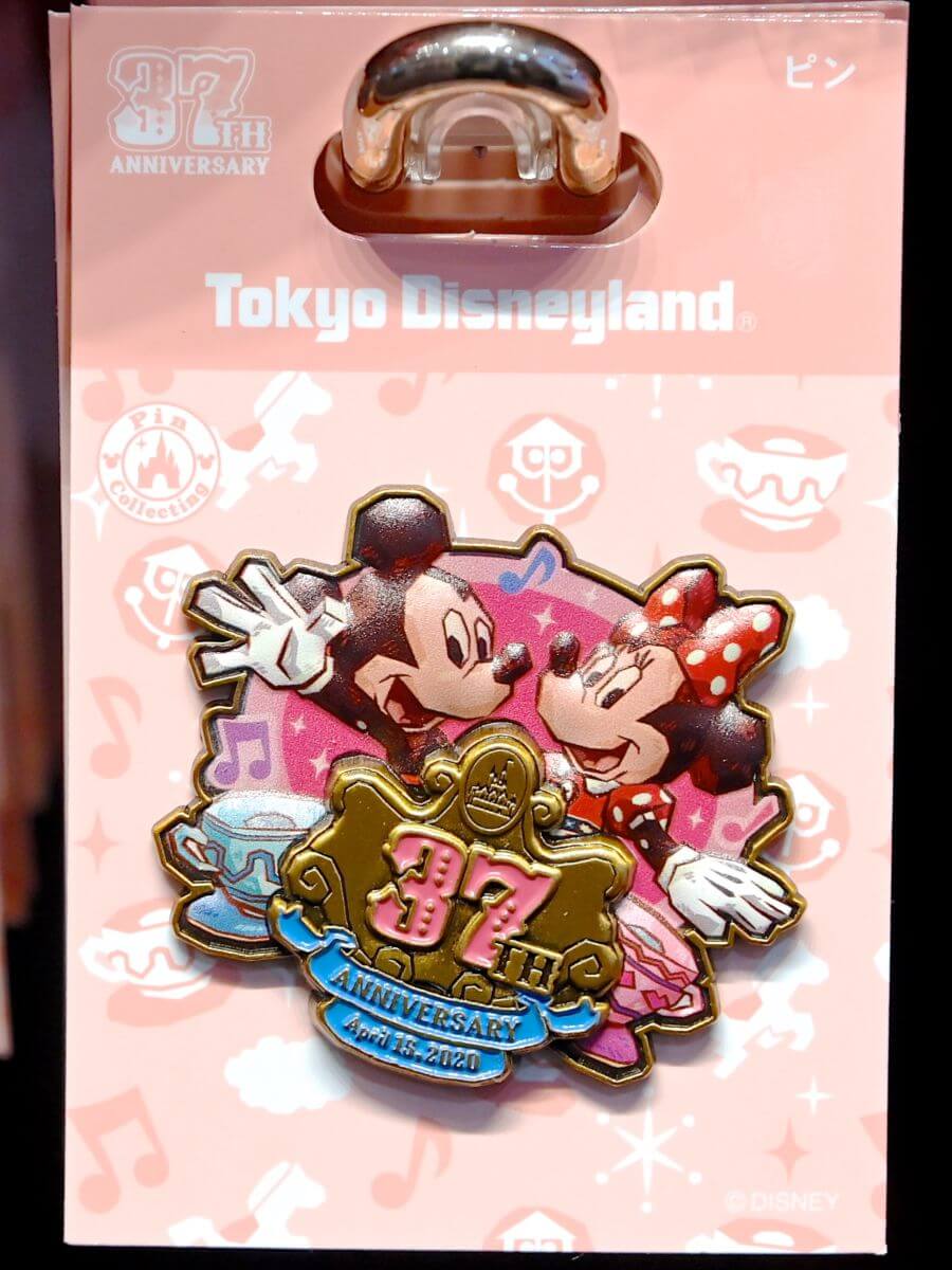 木彫り風のミッキーマウス、ミニーマウスがデザインされた37周年のピンバッジ。