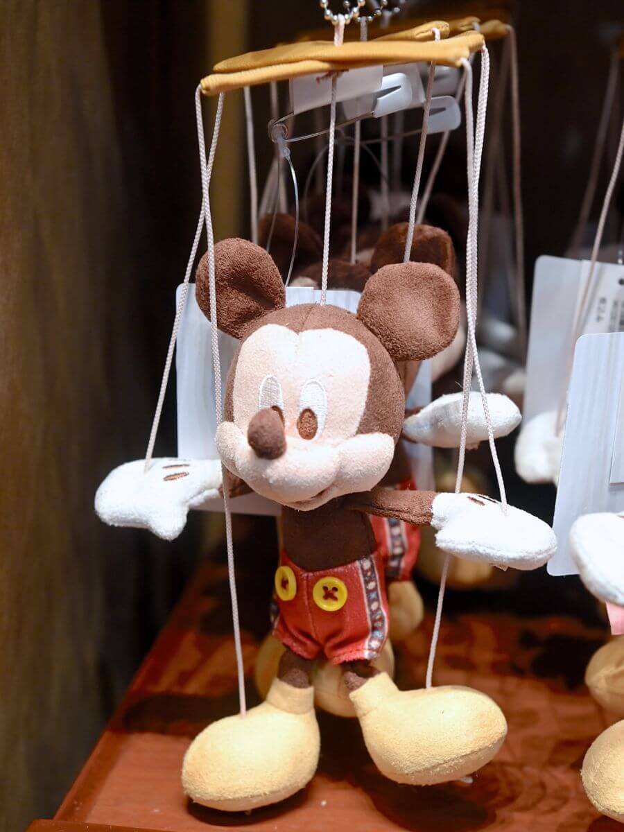 サスペンダーがかわいい木彫り風ミッキーマウスのハンドパペット。