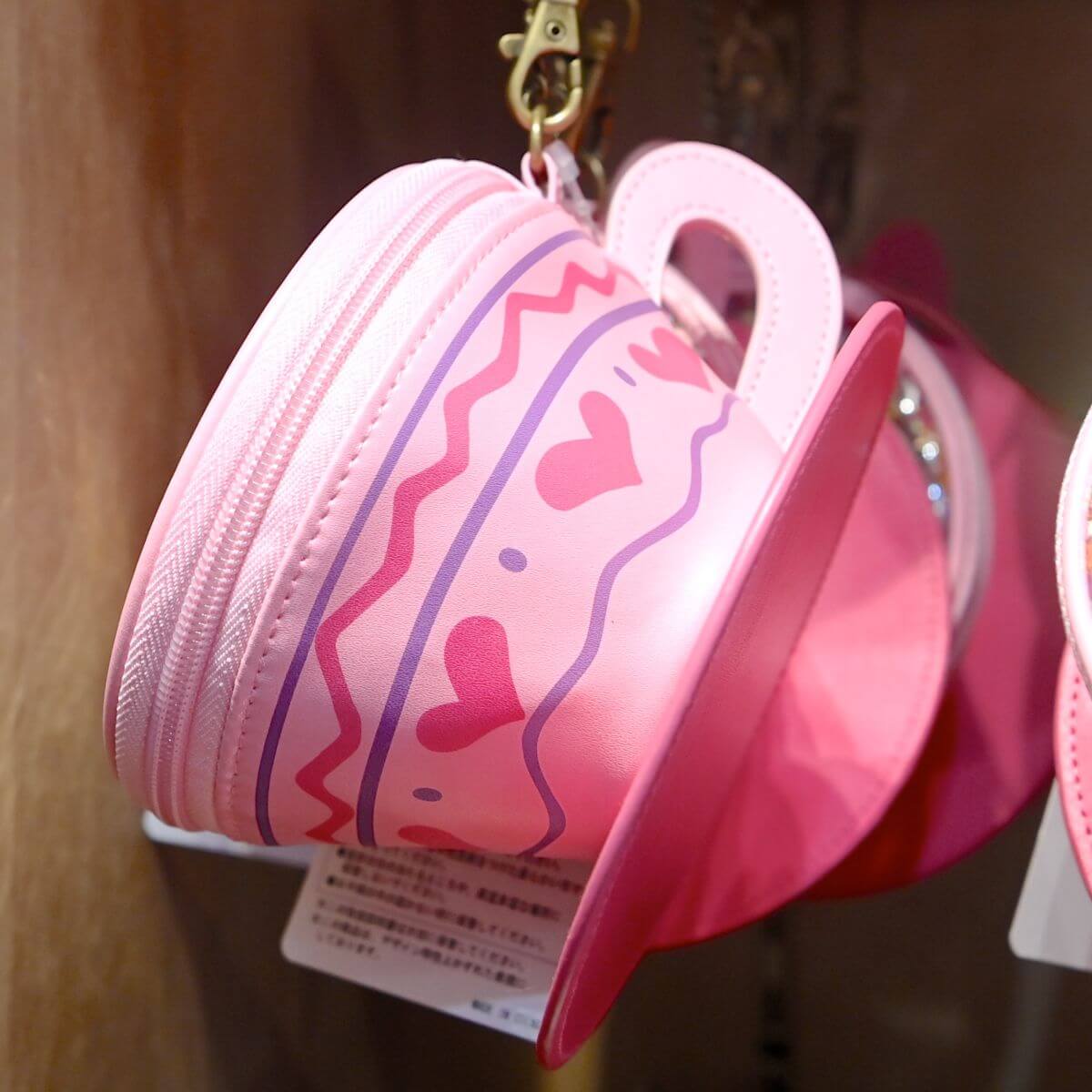 「アリスのティーカップ」のピンク色のティーカップ型ポーチ、キーチェーン付き。