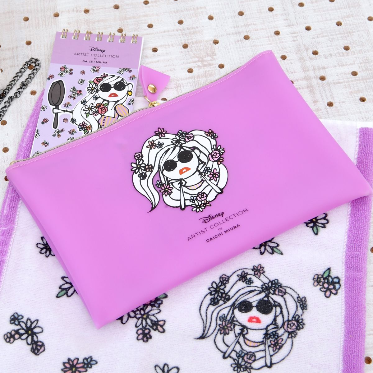 ラプンツェルにインスパイアされ、長い髪にお花をたくさん飾り付けた女の子がデザインされたフラットポーチ。