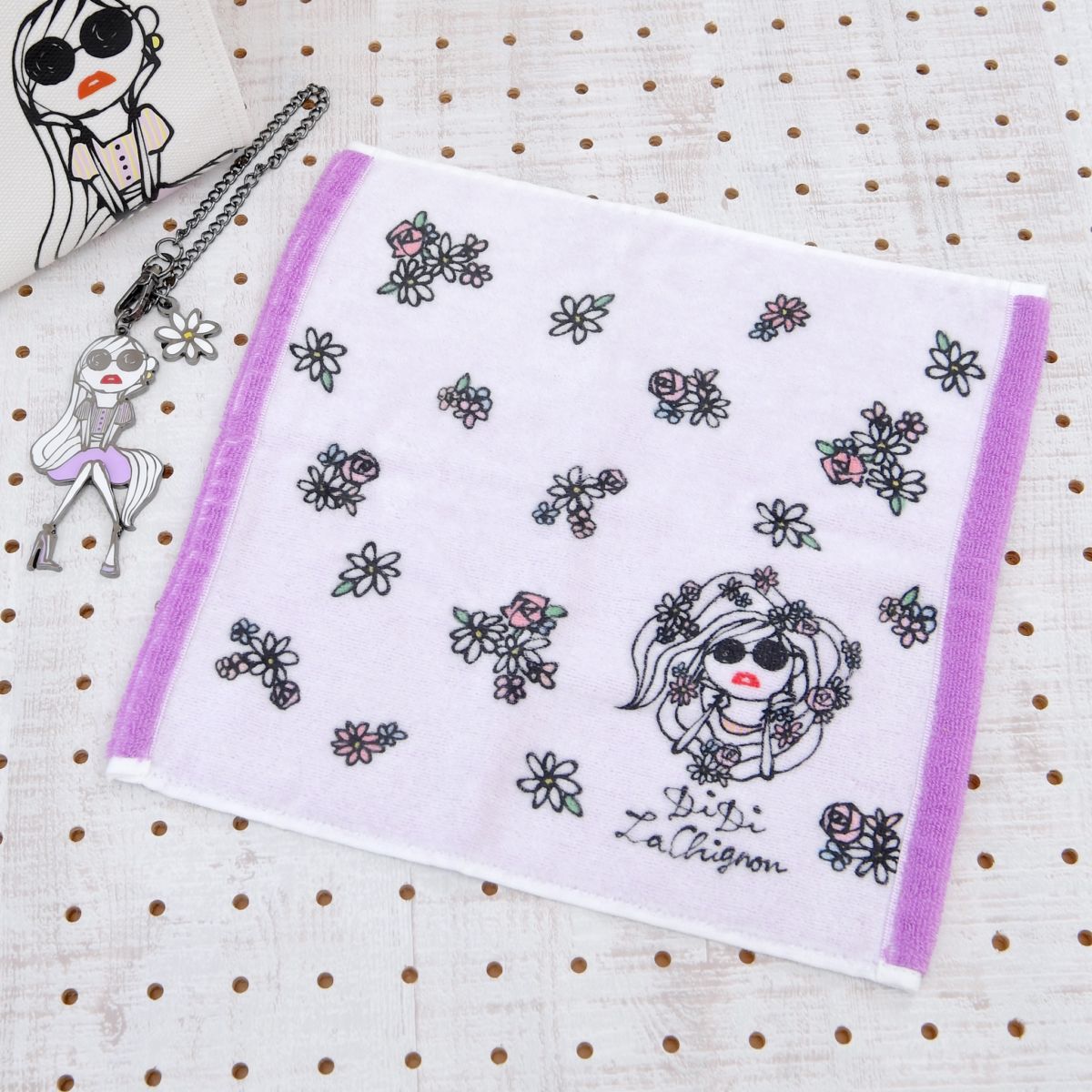 ラプンツェルカラーのタオルには長い髪の女の子とお花がデザインされています。