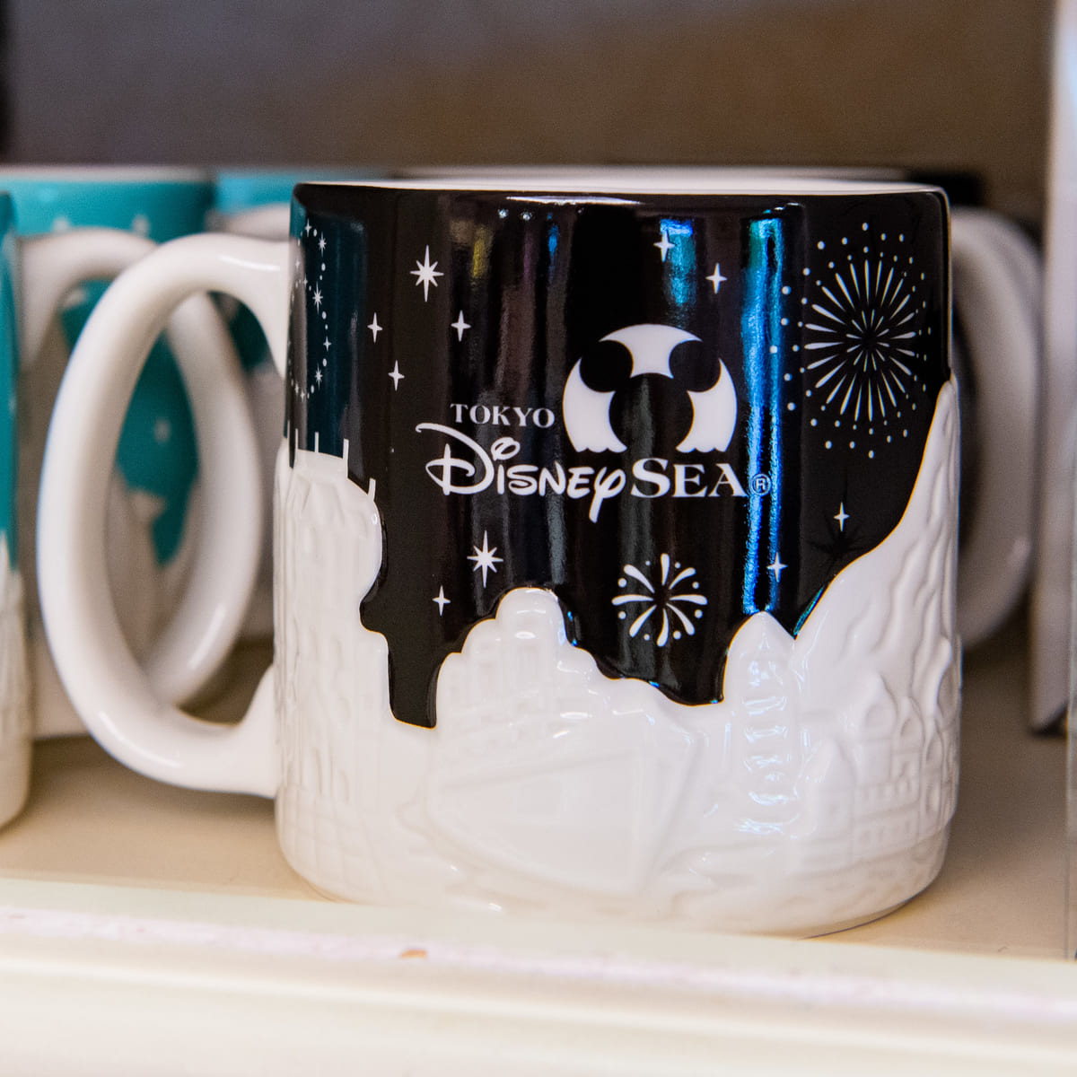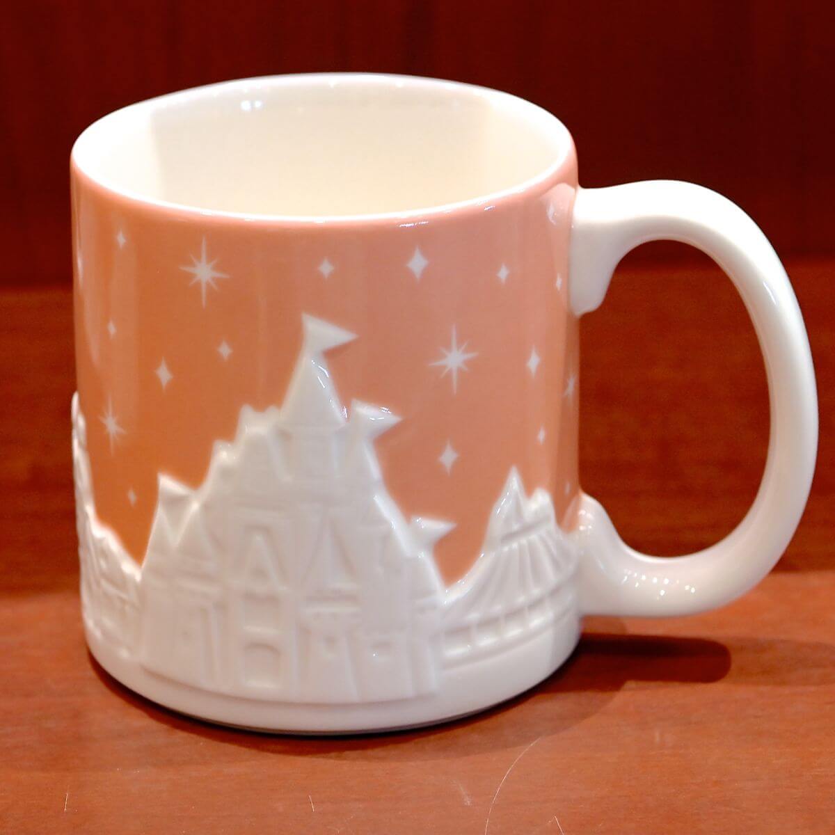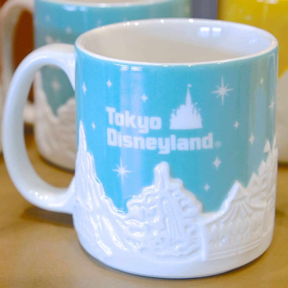 東京ディズニーランド、東京ディズニーシーの風景が立体的にデザインされたマグカップ。