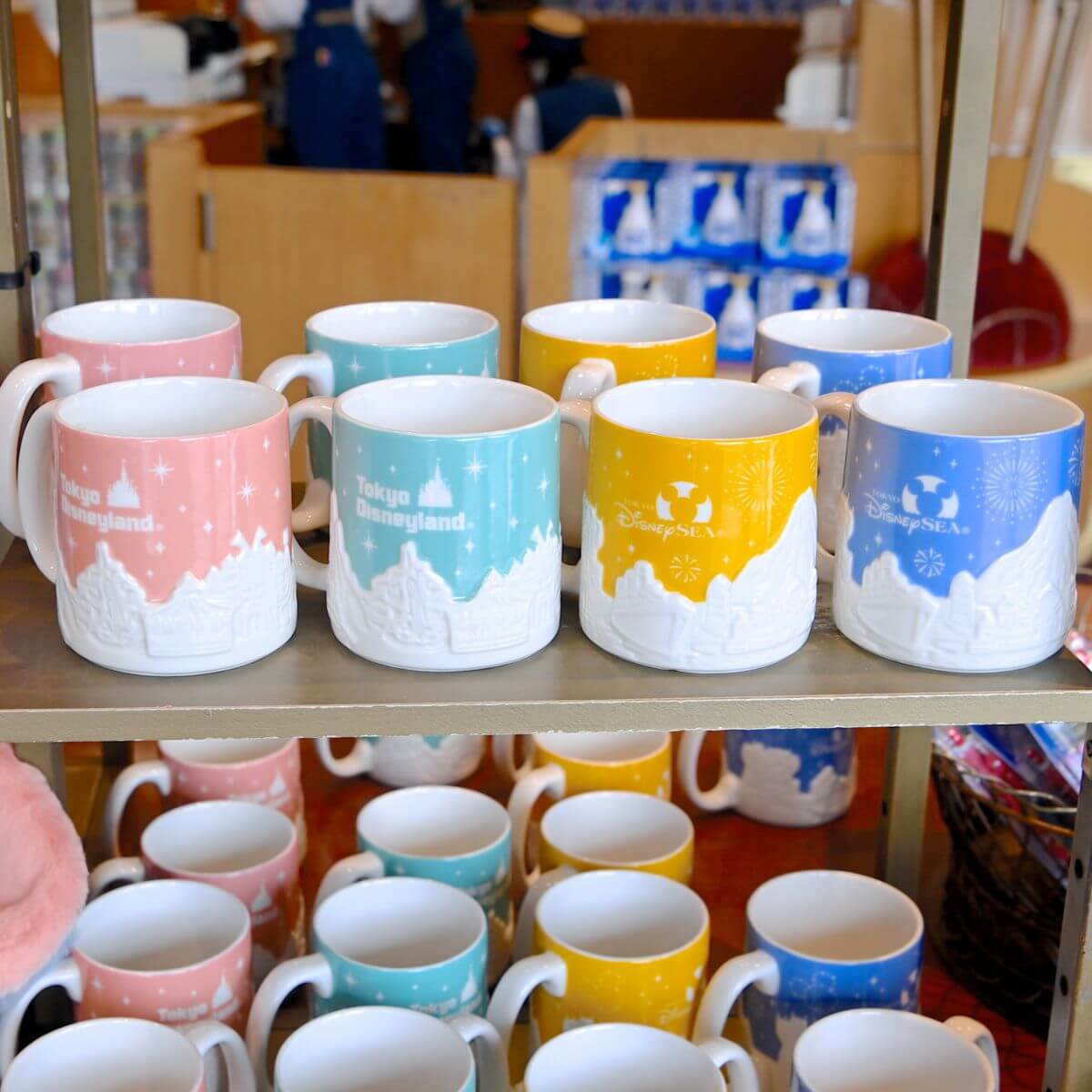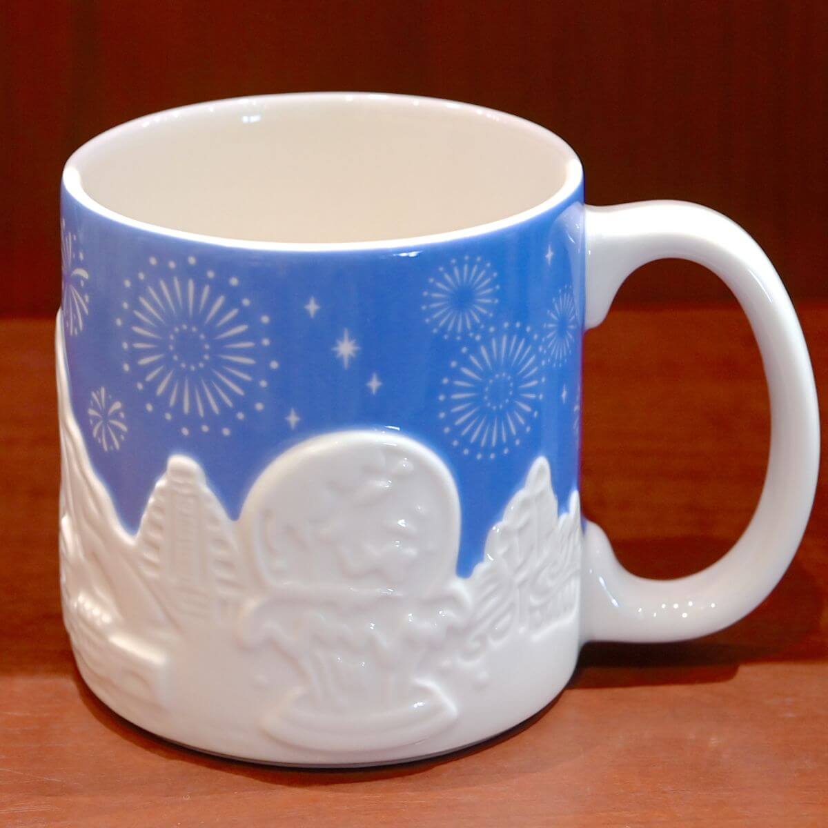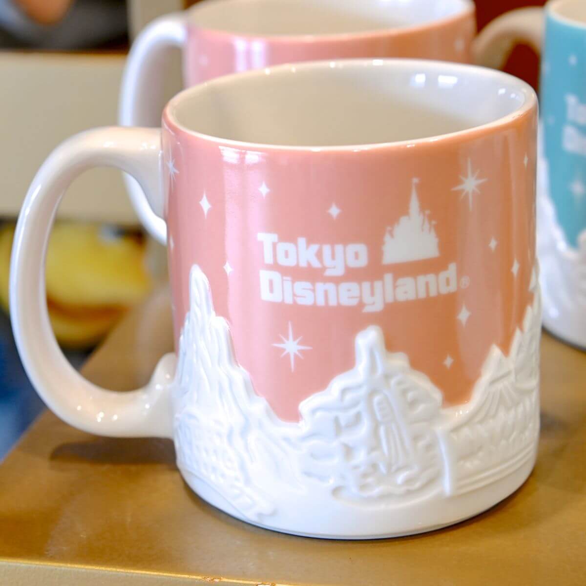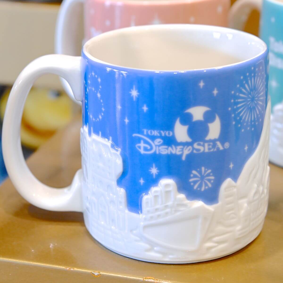 東京ディズニーランド、東京ディズニーシーの風景が立体的にデザインされたマグカップ。