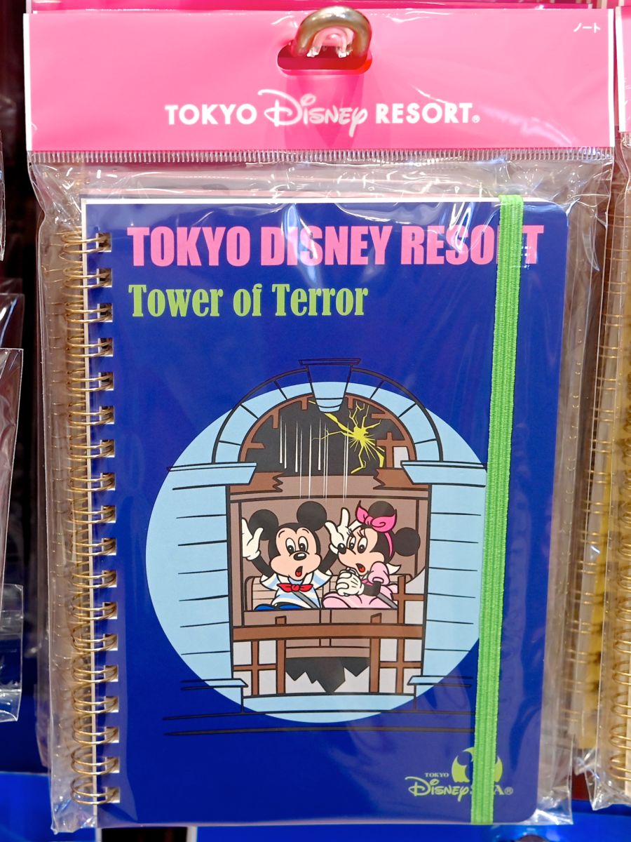 「タワー・オブ・テラー」にのるミッキーマウスとミニーマウスがデザインされたノート。