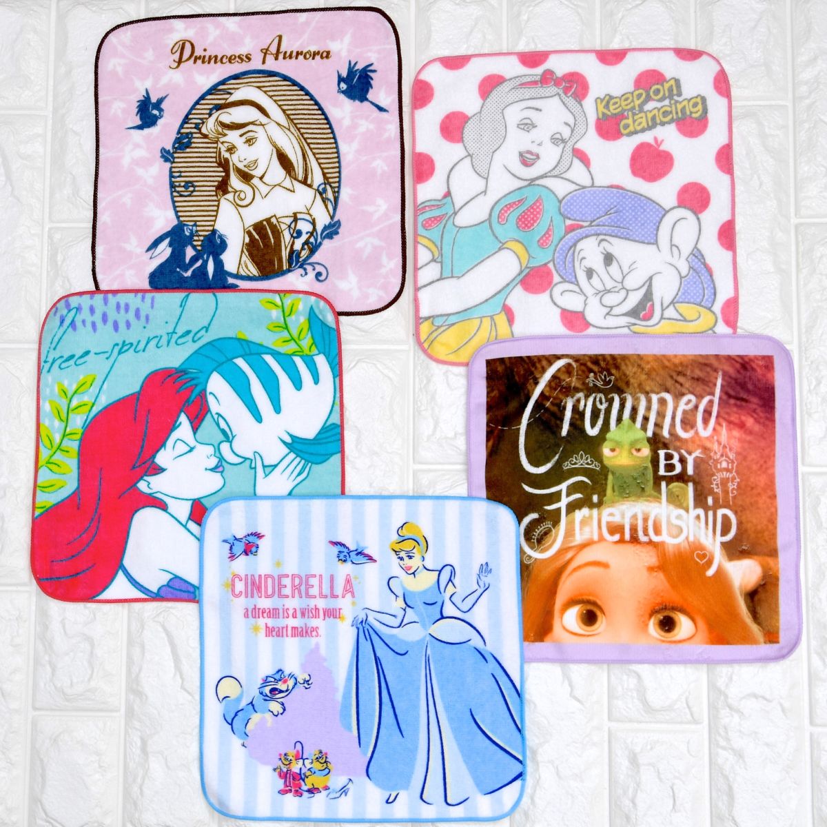 『白雪姫』『眠れる森の美女』『シンデレラ』『リトル・マーメイド』『塔の上のラプンツェル』デザインのハンドタオル5種類と