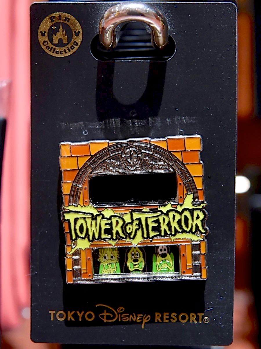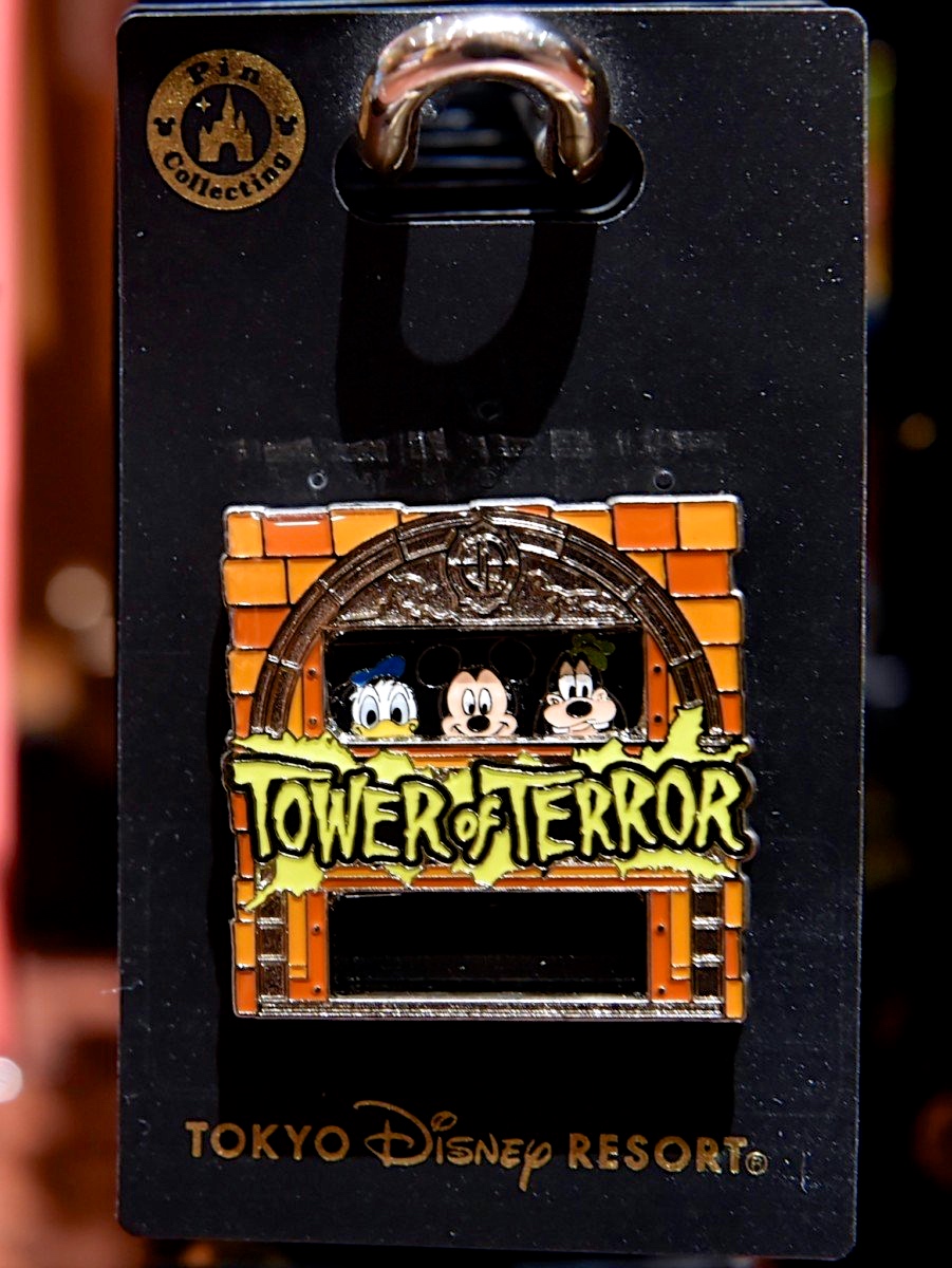 「タワー・オブ・テラー」に乗るミッキーマウス、ドナルドダック、グーフィーがデザインされたアトラクションデザインピンバッジ。
