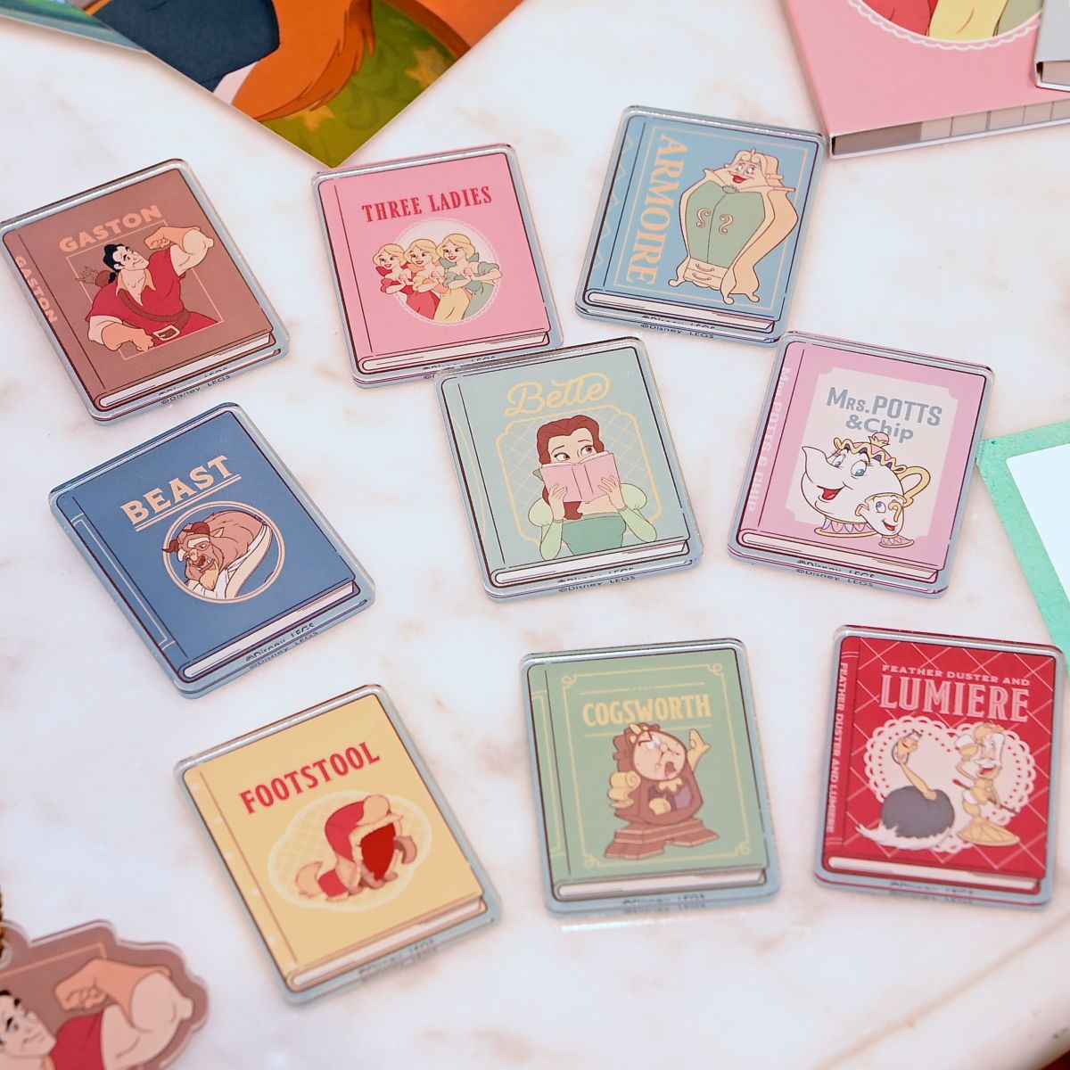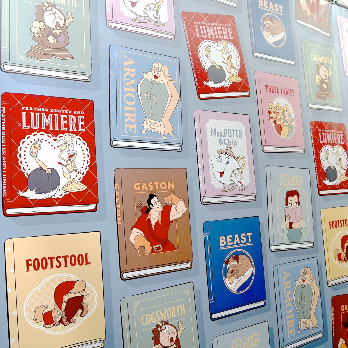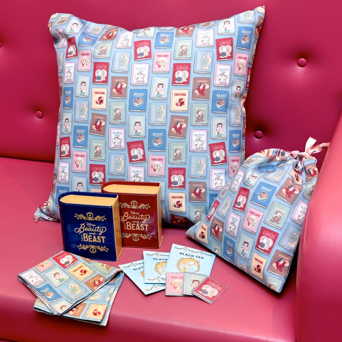 ベル、野獣、ガストン、3人娘、ポット夫人&チップ、コグスワース、ルミエール&フェザーダスター、ワードローブ、フットスツールがデザインされています。