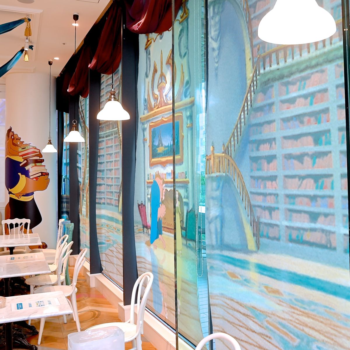 野獣の城内の広々としたすてきな図書室を訪れた気分になれる、フォトジェニックなスペシャルカフェ。