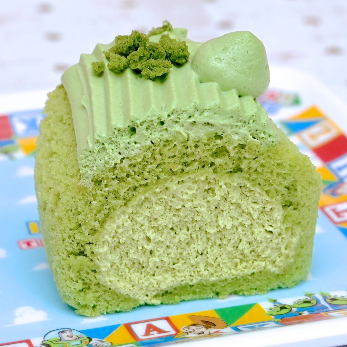 ティラノザウルスのプラスチック製のおもちゃ、レックスはレックスカラーの抹茶ロールケーキ。