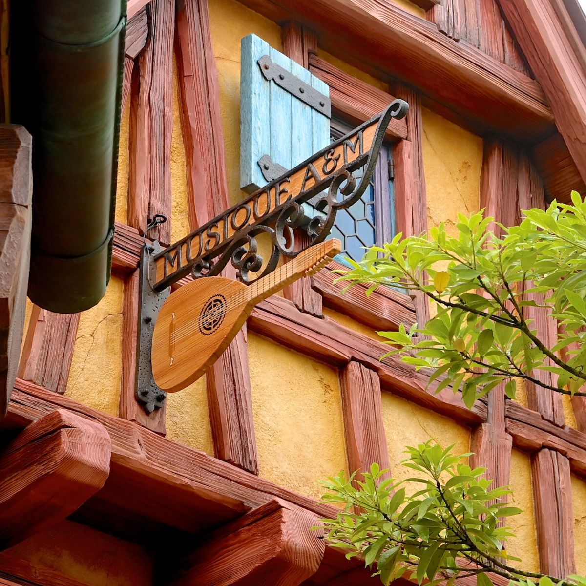 その上にはディズニーアニメーション映画『美女と野獣』の作曲家であるアラン・メンケンと作詞家のハワード・アシュマンのイニシャルをつかった「Mucsique A&M」という看板。