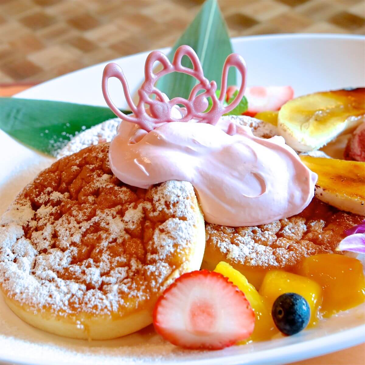 スティッチのガールフレンド、エンジェルのチョコレートがトッピングされたポリネシアン風デザートパンケーキ。