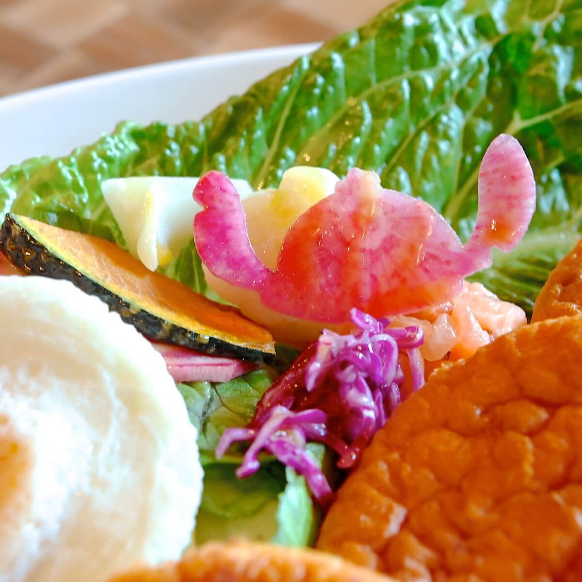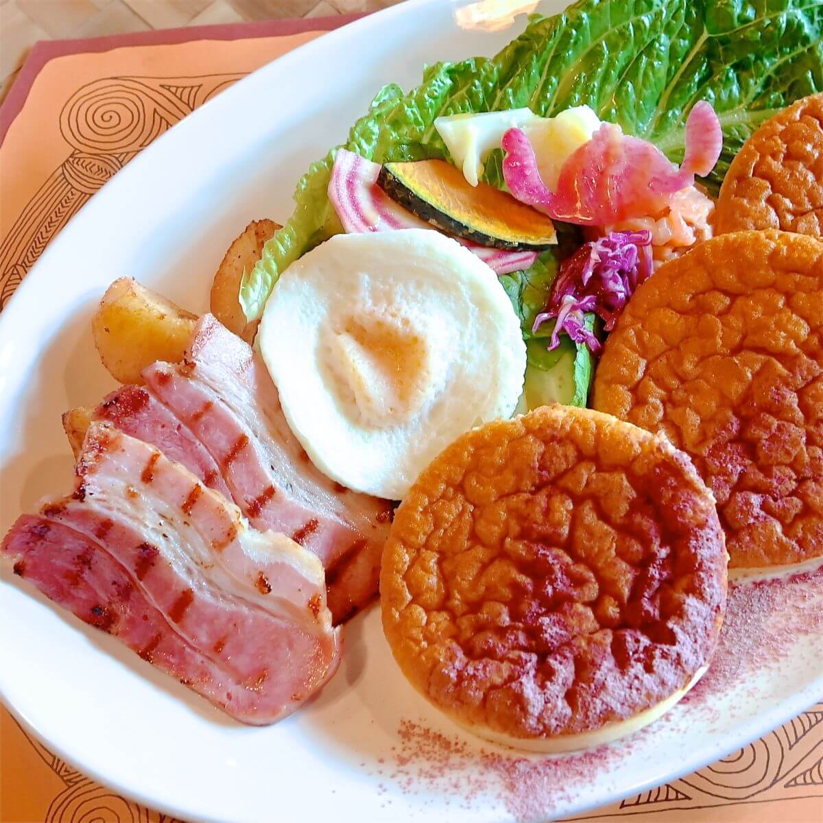 スティッチのお顔型の紅芯大根がトッピングされたランチパンケーキセット。