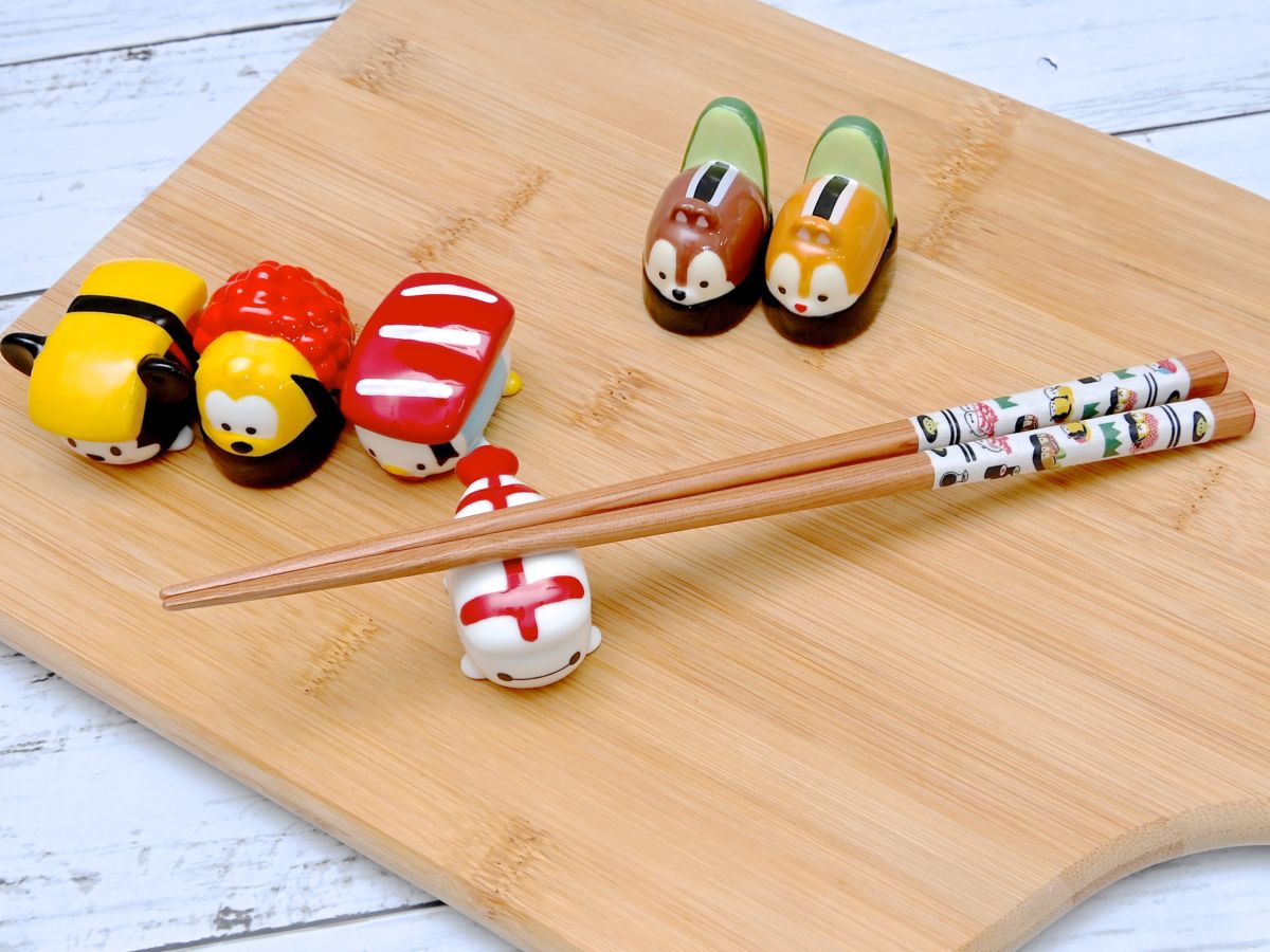 ツムツムたちがデザインされた和風な絵柄のお箸とかわいい箸置き。