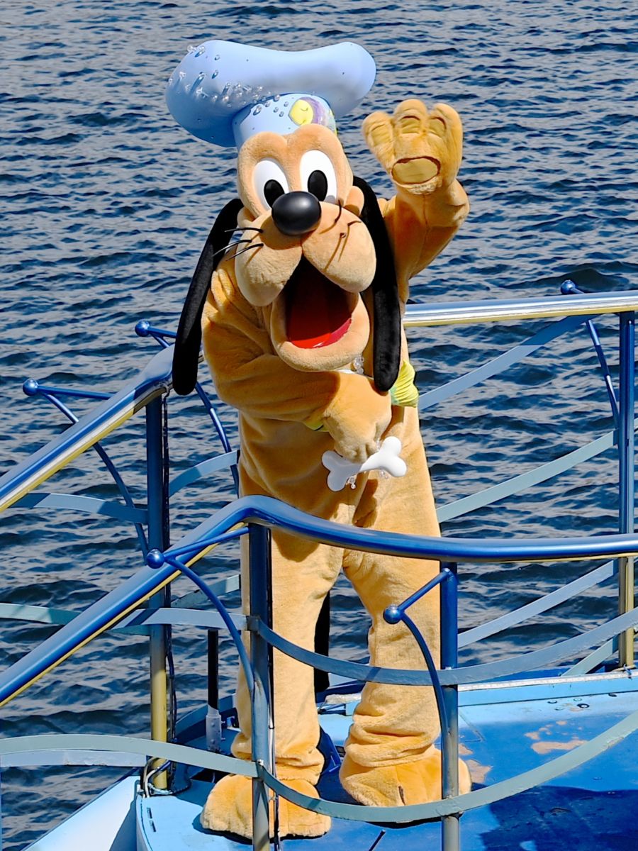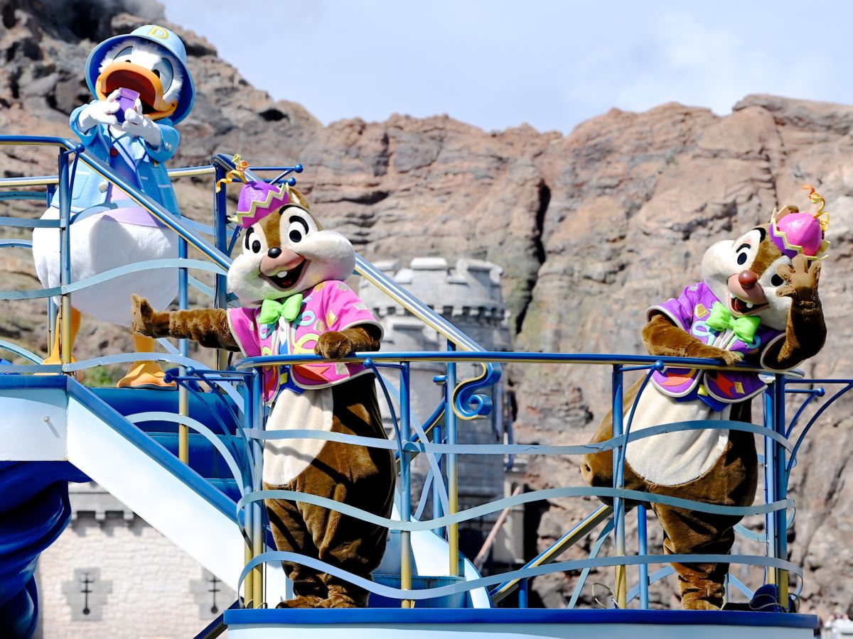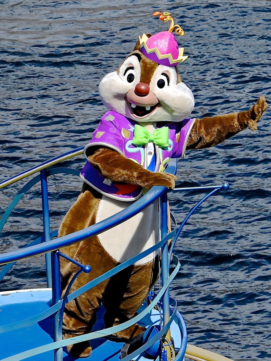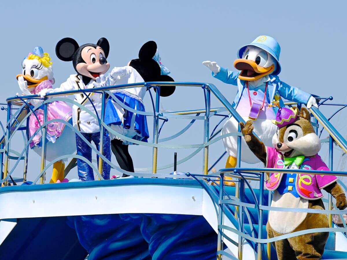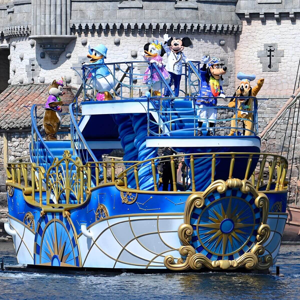 「ミート&スマイル」が流れる船に乗って、ミッキーマウス、ミニーマウス、ドナルドダック、デイジーダック、グーフィー、プルート、チップ、デールが登場!