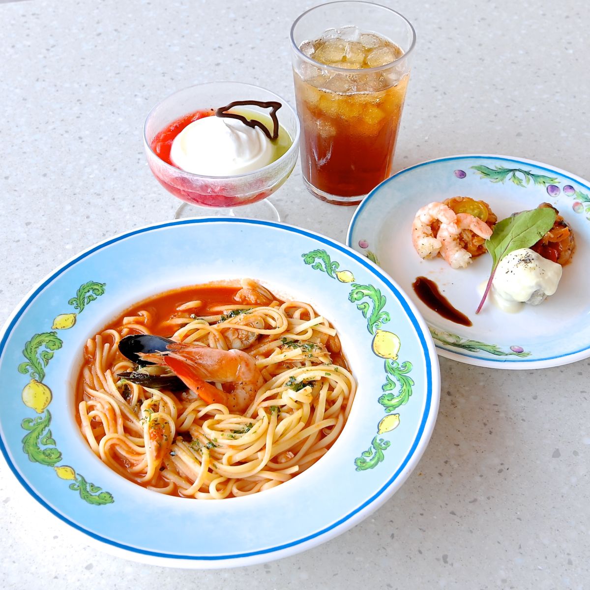 そんなカフェ・ポルトフィーノで提供されている前菜、パスタ、デザート、ドリンクがセットになったシェフのおすすめセットを紹介します☆