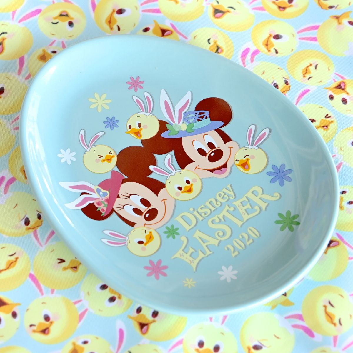 イースターらしく、たまご形のスーベニアプレートには、うさピヨたちに囲まれたミッキーマウスとミニーマウスがデザインされています。