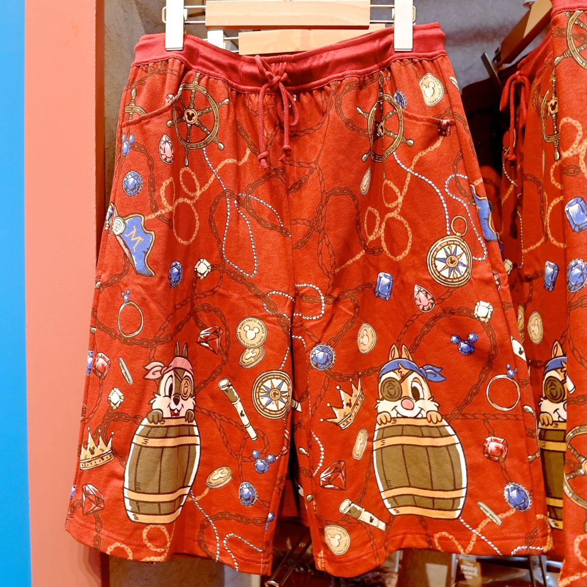 樽に入ったチップとデール、舵やコンパス、お宝がデザインされたハーフパンツ。