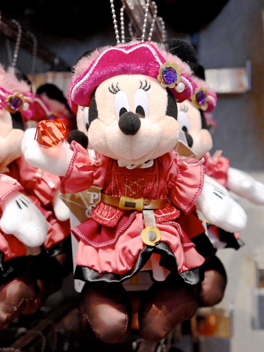 ミニーらしいピンクの海賊帽、赤いコスチュームを着たミニーマウスぬいぐるみバッジ。