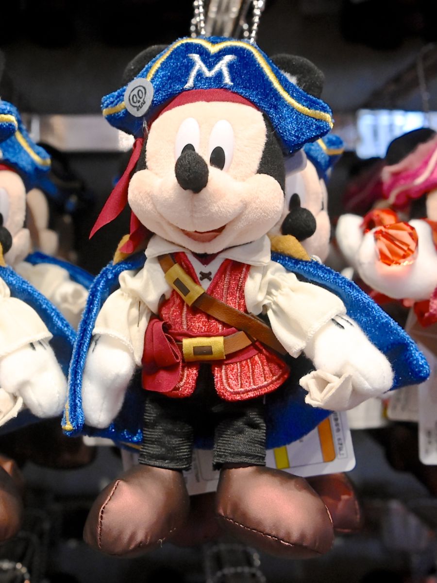 M、ドクロがデザインされたブルーの海賊帽、マントがかっこいいミッキーマウスぬいぐるみバッジ。