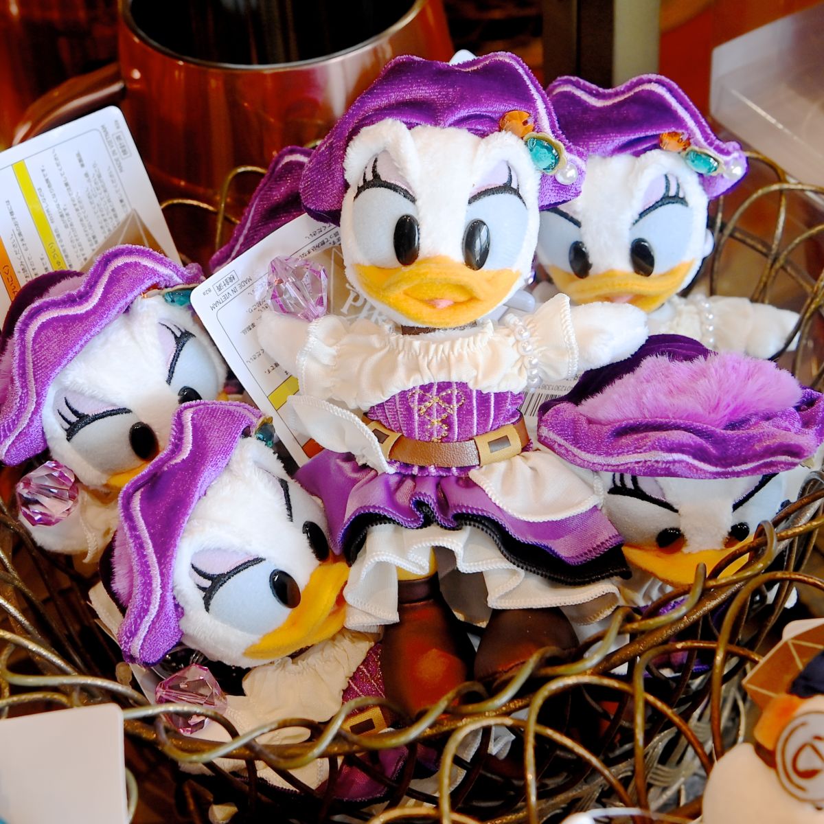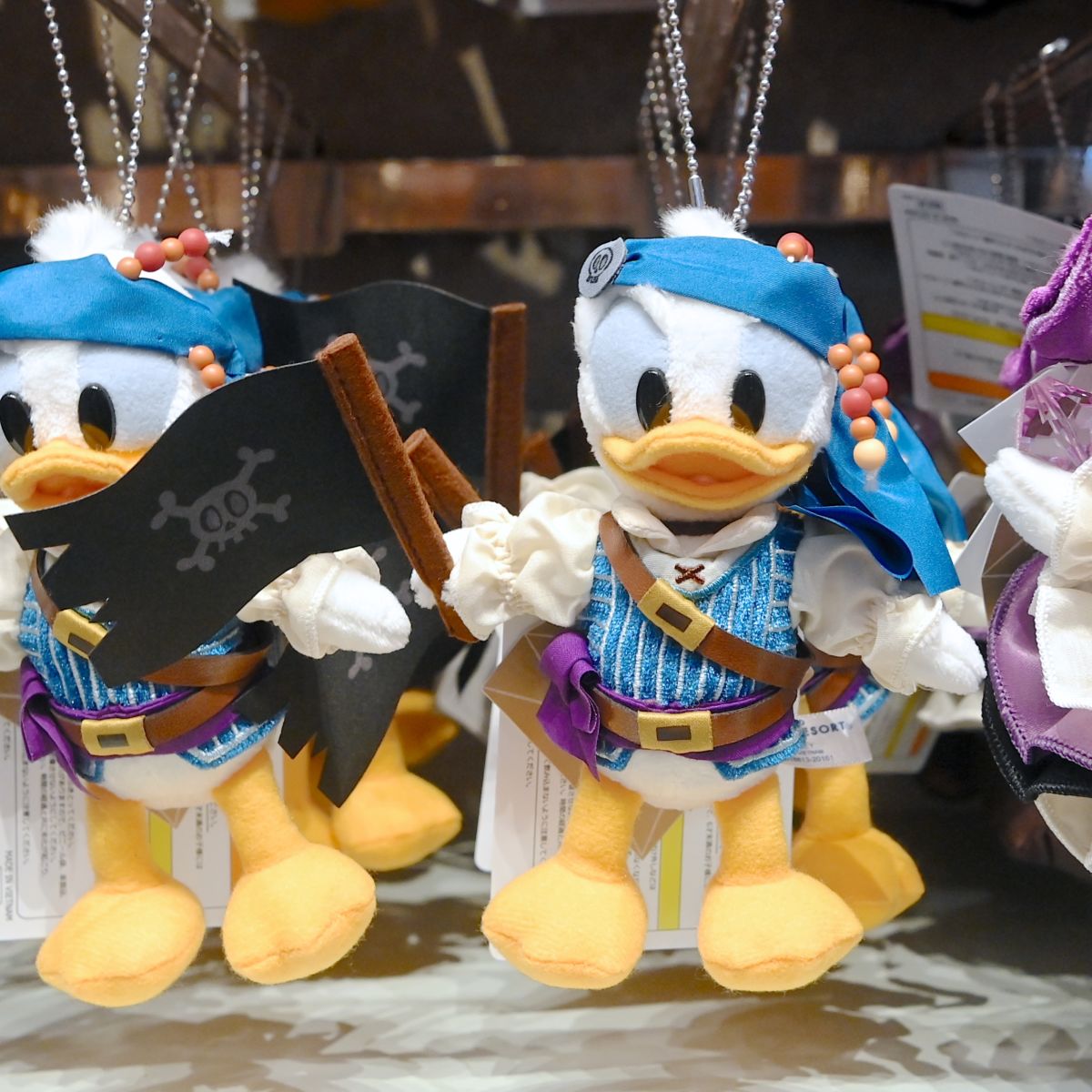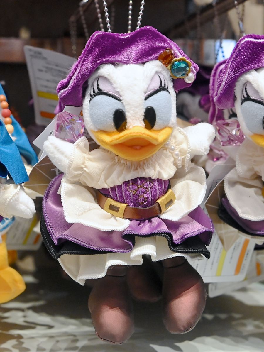 紫の海賊帽、ワンピースをきたデイジーダックのぬいぐるみバッジ。
