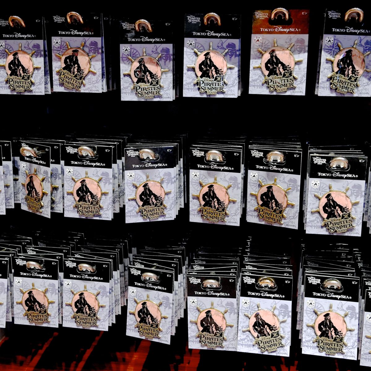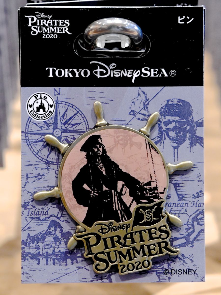 舵型にキャプテン・ジャック・スパロウ、“ディズニー・パイレーツ・サマー2020”のロゴがデザインされたピンバッジ。
