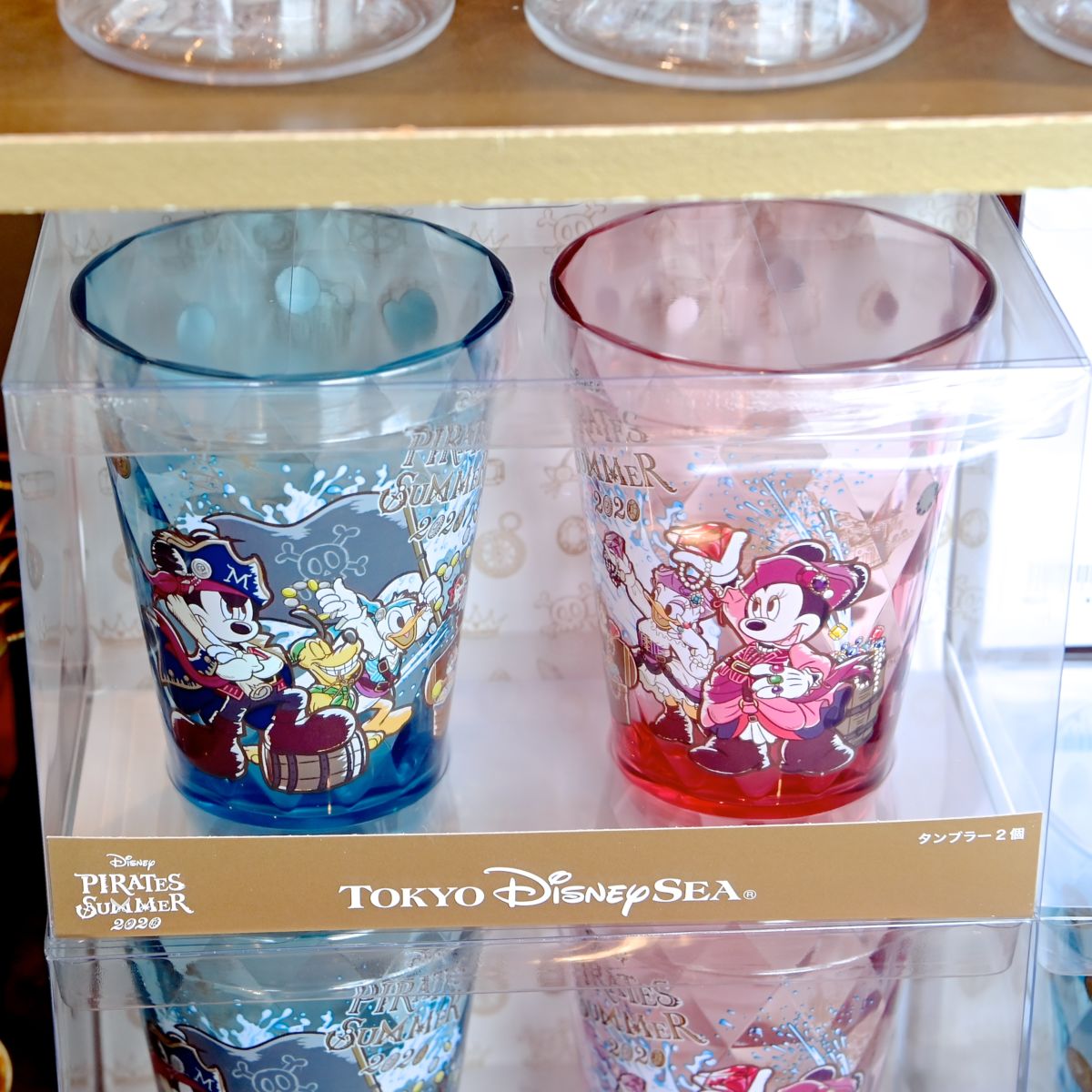 海賊ミッキーマウス、ドナルドダック、プルート、チップ&デールがデザインされた青色のタンブラーと、ミニーマウス、デイジーダック、クラリスがデザインされた赤色のタンブラーのセット。
