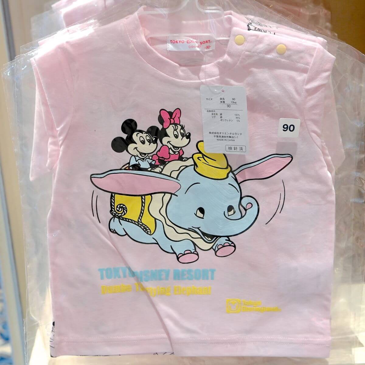 東京ディズニーランドのアトラクション「空飛ぶダンボ」にのるミッキーマウスとミニーマウスがデザインされたピンク色のTシャツ。