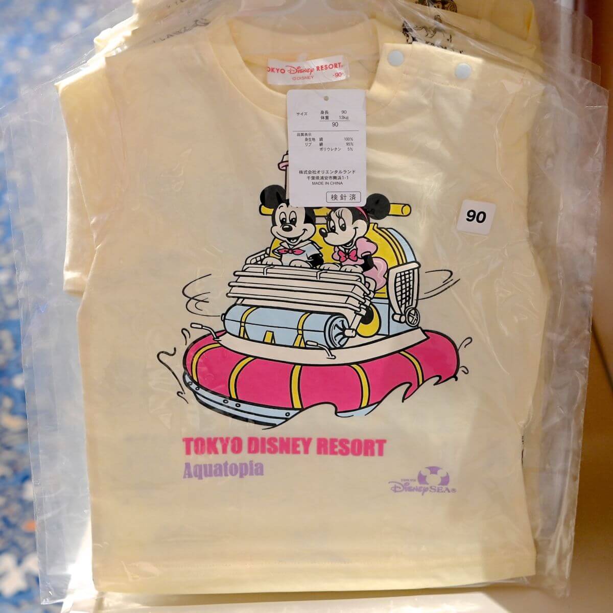 東京ディズニーシーのアトラクション「アクアトピア」に乗るミッキーマウスとミニーマウスがデザインされた黄色のTシャツ。