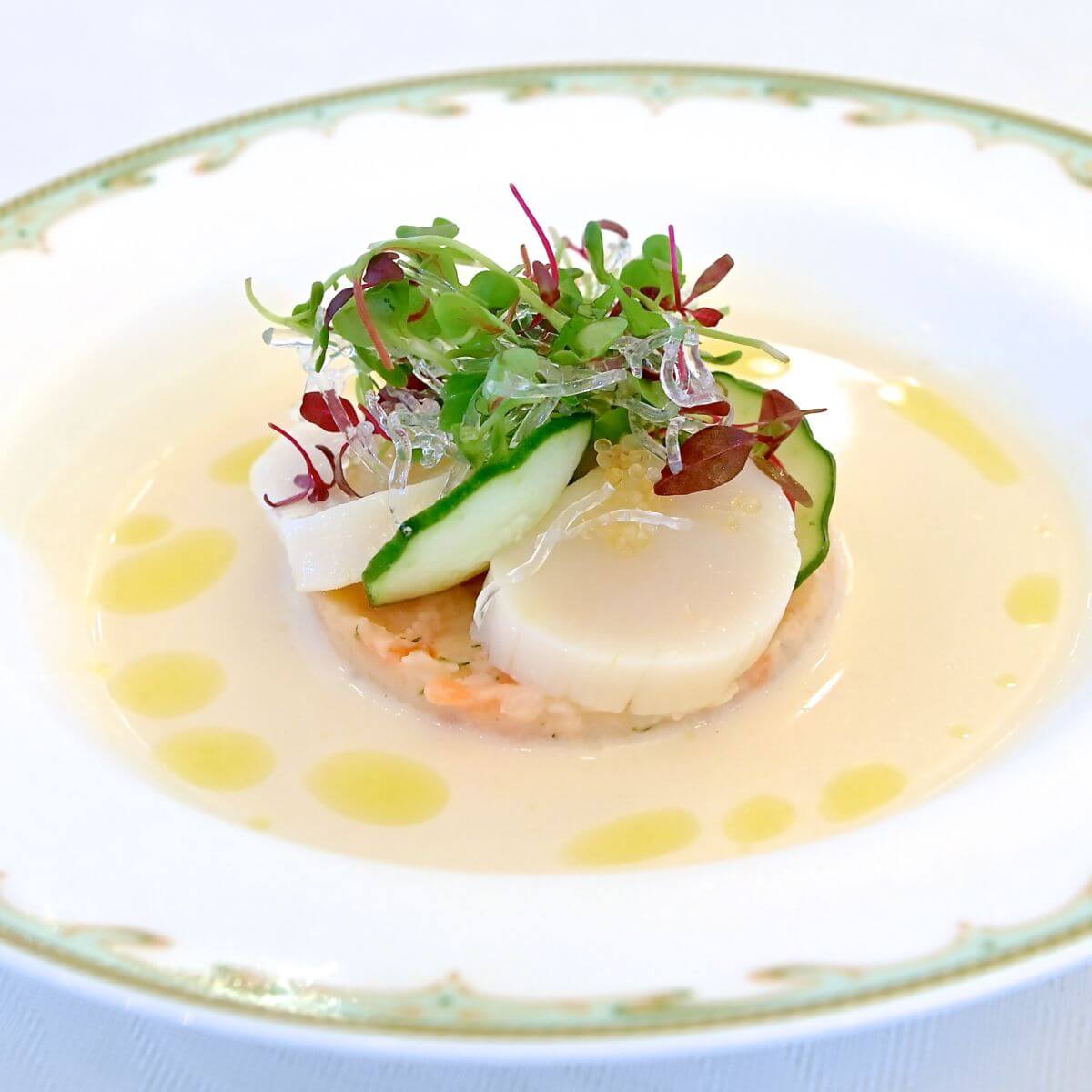 前菜は、夏に嬉しい冷製ポテトクリームスープに、サーモントラウト、帆立貝のマリネ、サラダ。