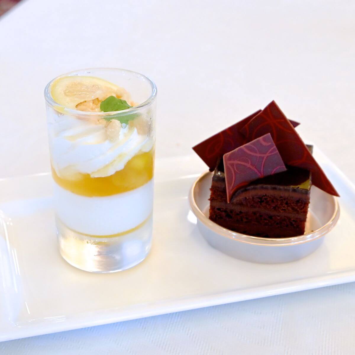 デザートは、トロピカルなレモンムースとマンゴーのグラスデザートとしっとり濃厚なチョコレートケーキです。
