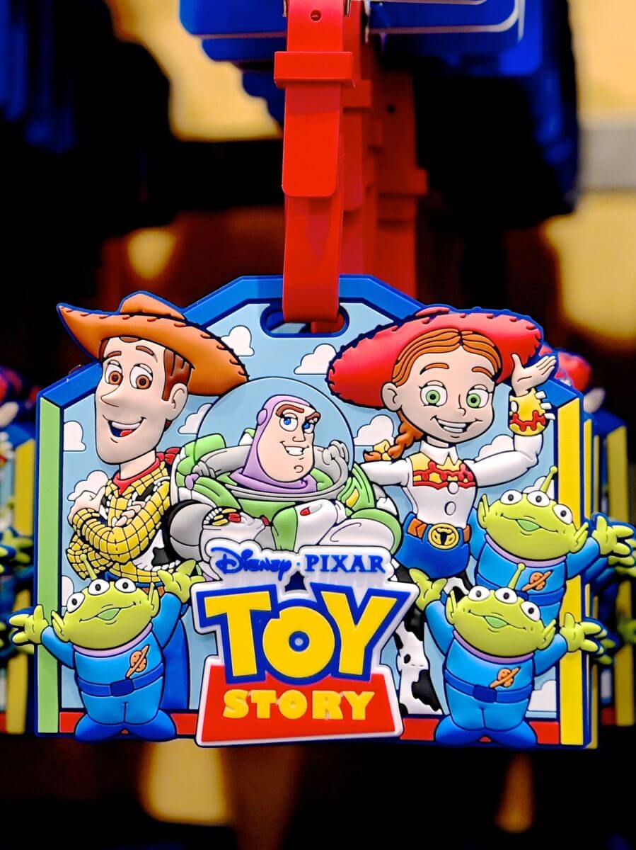 ディズニー&ピクサー映画『トイ・ストーリー』のキャラクターたちがデザインされたラゲッジタグ。