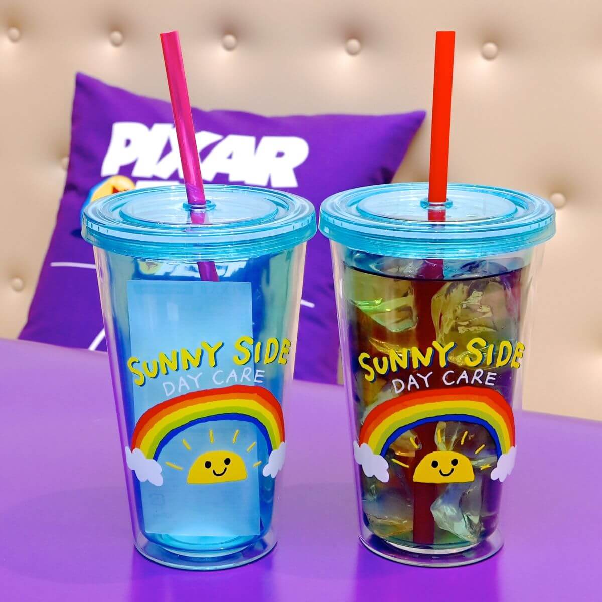 『トイ・ストーリー3』の舞台となるサニーサイド幼稚園のロゴがデザインされたタンブラー付きストレートアイスティ。