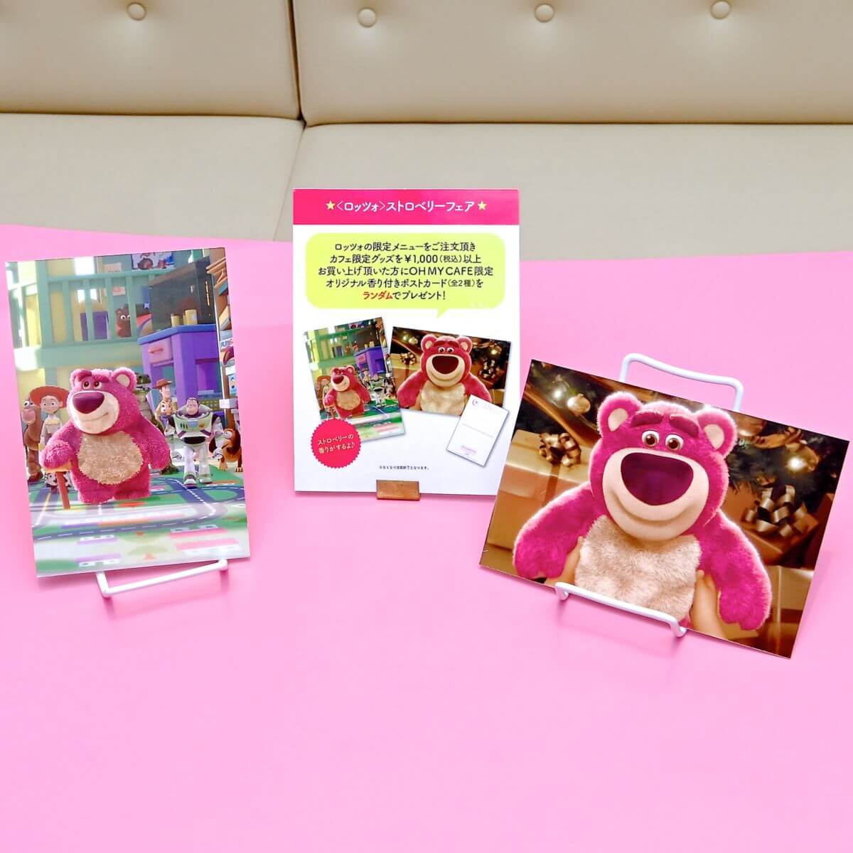 「トイ・ストーリー」シリーズに登場する人気キャラクター「ロッツォ」の限定メニューを注文し、カフェ限定グッズを1,000円(税込)以上購入するとOH MY CAFE限定「オリジナル香り付きポストカード(全2種)」がランダムでプレゼントされます。