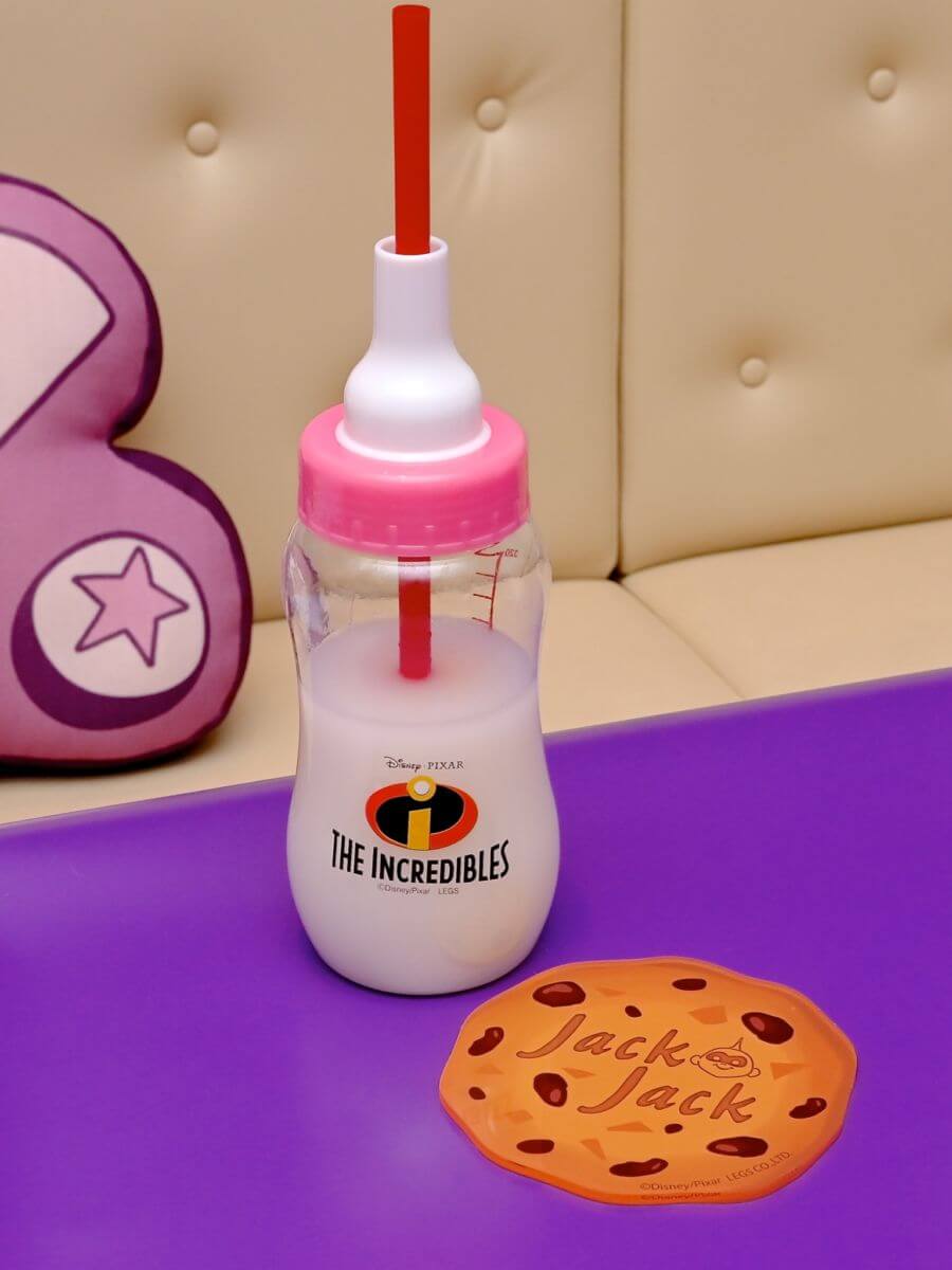 『Mr.インクレディブル』ファミリーの末っ子「ジャックジャック」の大好物、チョコチップ風クッキーのコースターをそえた哺乳瓶入りドリンク。