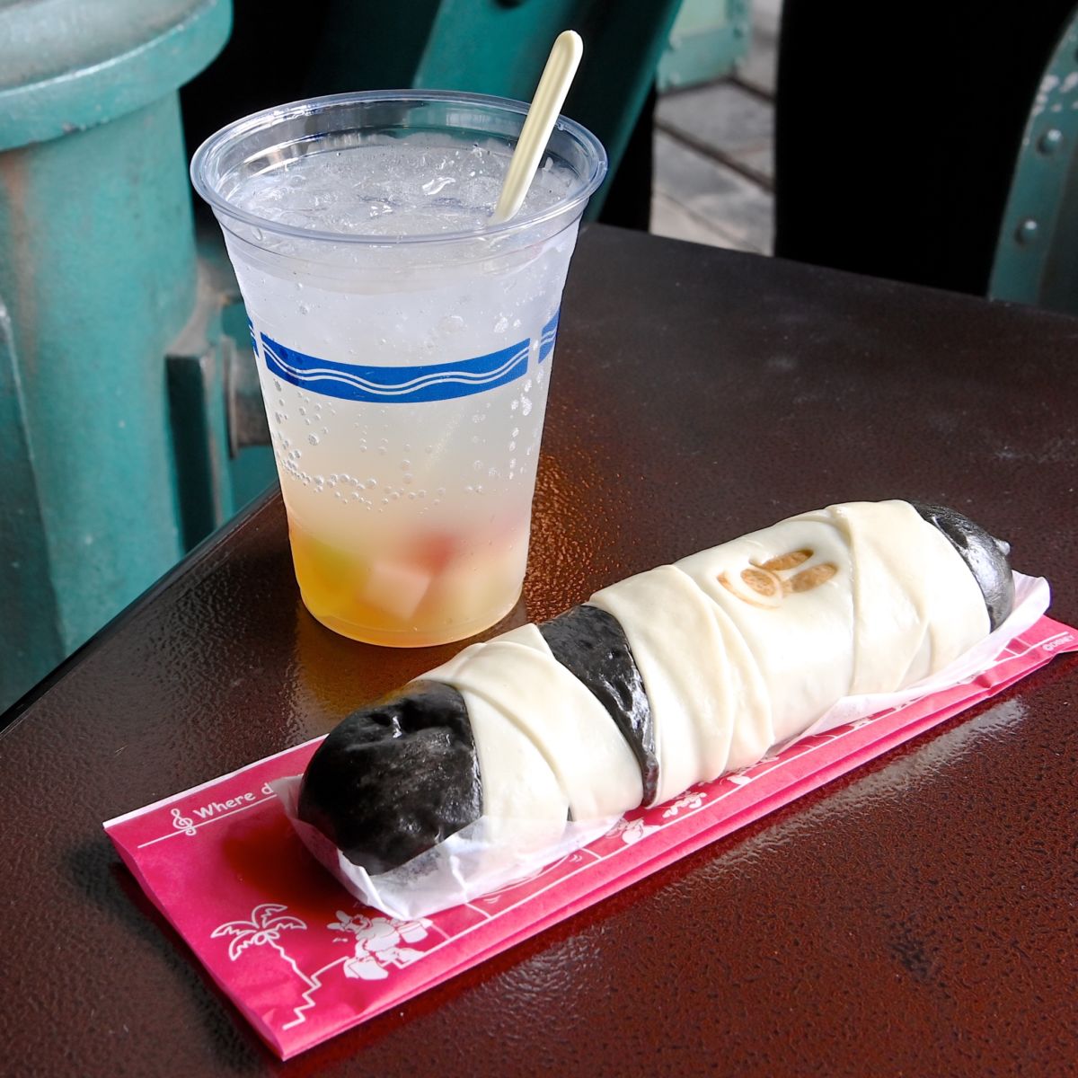 「ノーチラスギャレー」の名物メニュー、人気のギョウザドッグのような、縦長の中華まん。