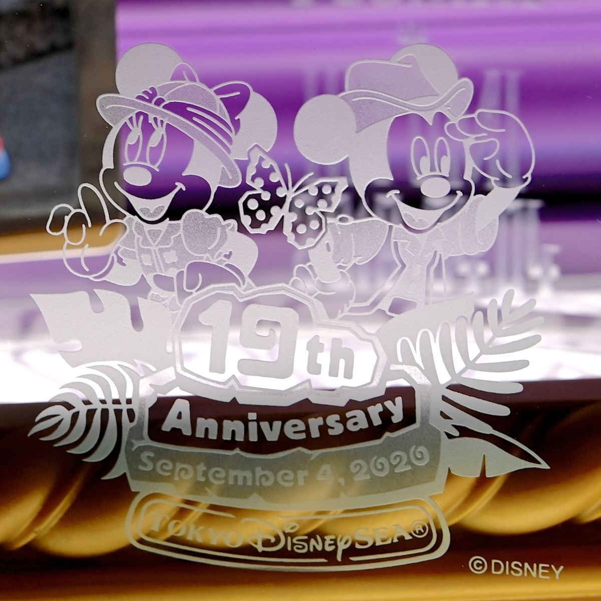 ジャングルで発見を楽しむミッキーマウスとミニーマウス、東京ディズニーシー19周年のロゴがデザインされたグラス。