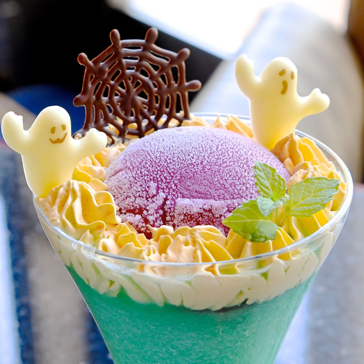 オレンジジュース、アップルジュース、ブルーシロップ、青リンゴシロップ、アップルパイシロップ、カルピス入りのシャーベット状のドリンクに、たっぷりのパンプキンホイップクリーム、グレープソルベ、ミントがトッピングされています。