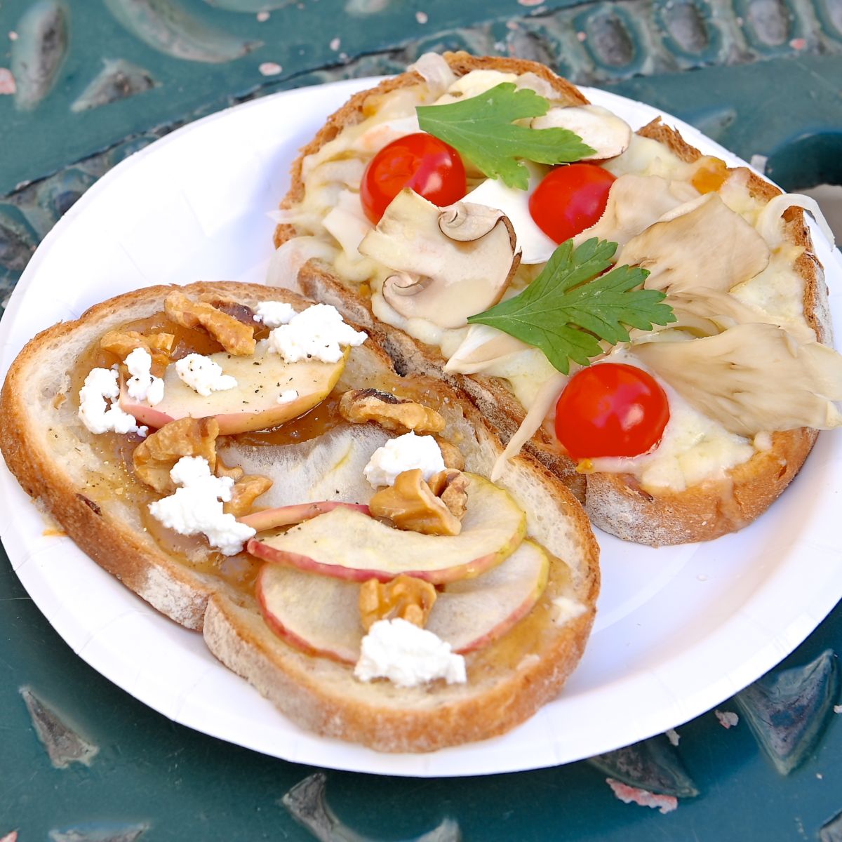 ソイミートのまろやかなキーマカレー、舞茸、ミニトマトなどトッピングされたお食事系と焼きリンゴ、カッテージチーズ、くるみなどトッピングされたデザート系のオープンサンドウィッチです☆