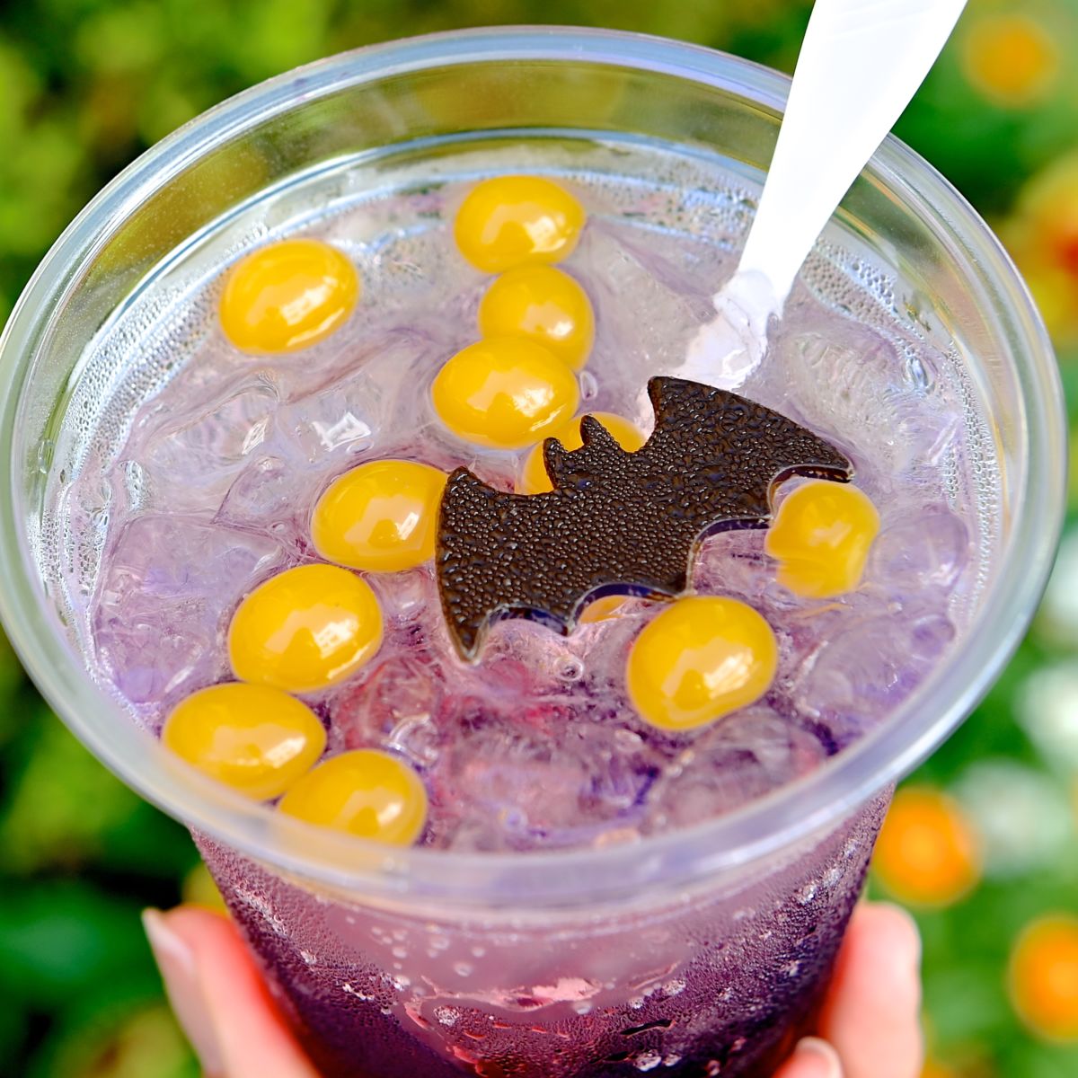 プチプチ食感のマンゴーコーティングジュース、コウモリのチョコレートがトッピングされています。