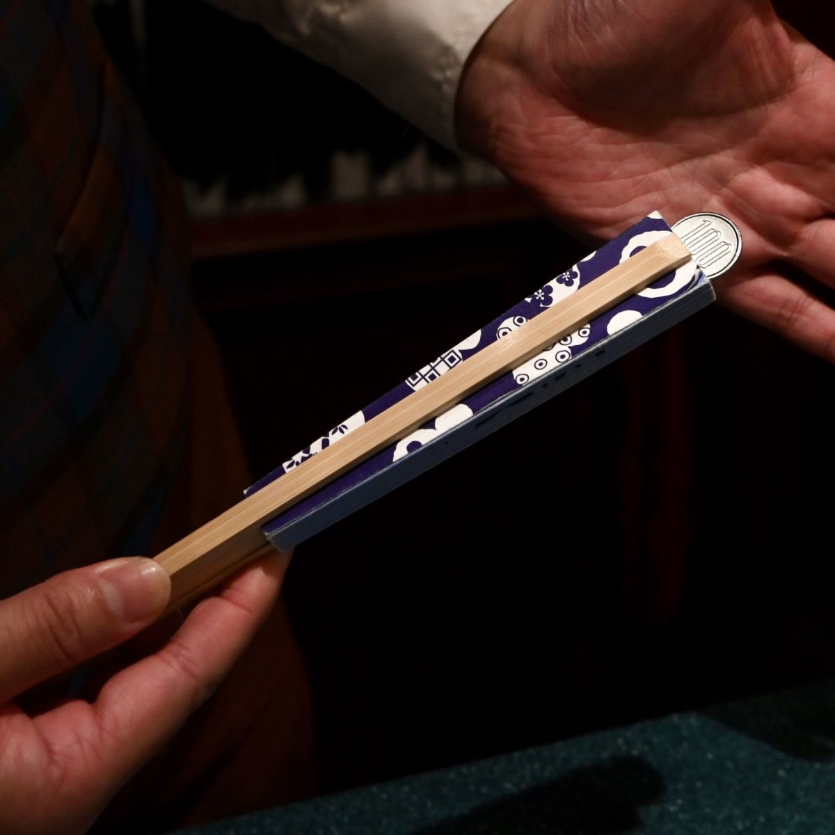 2.扇子の先で相手にさわると100円玉があらわれます。